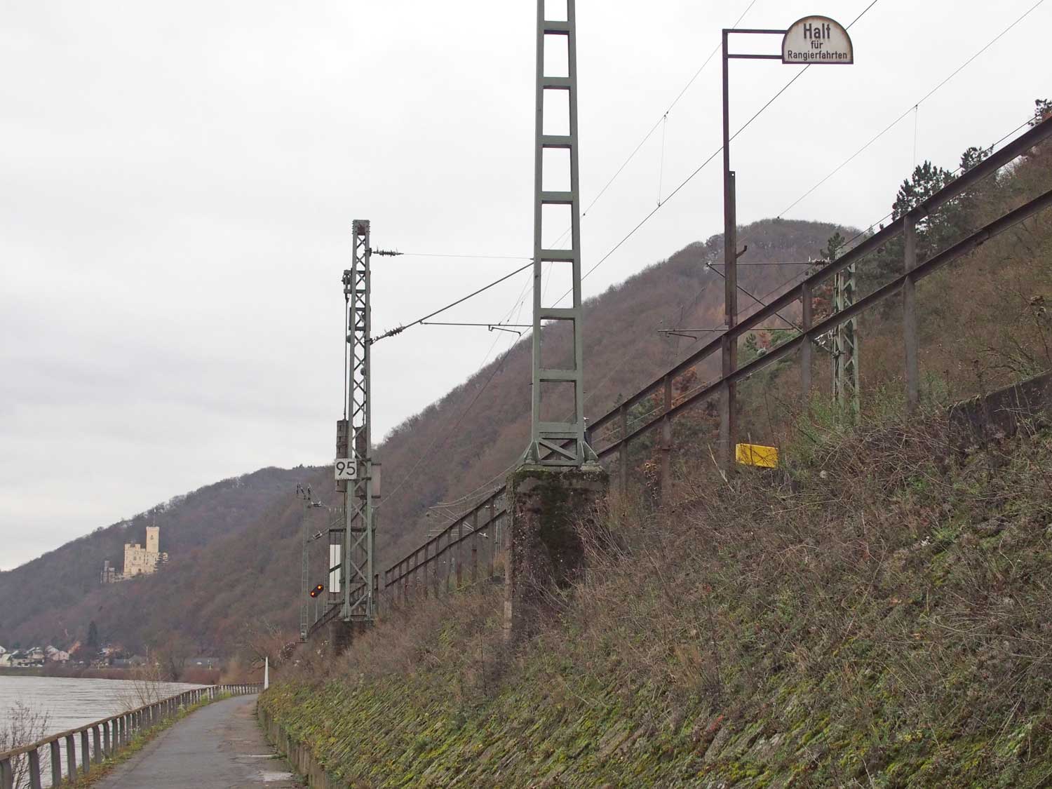 km 95,4 (Stein und Tafel) und km 95,5 (Stein) bei Kapellen-Stolzenfels - Blick Richtung Bingerbrück/Bingen