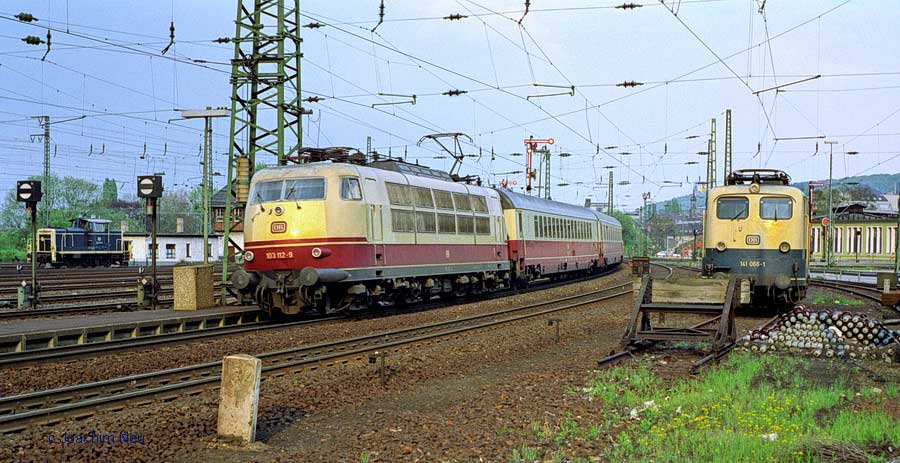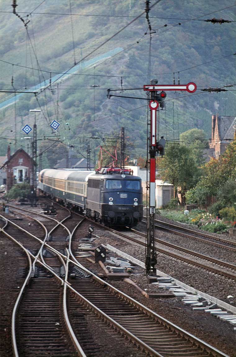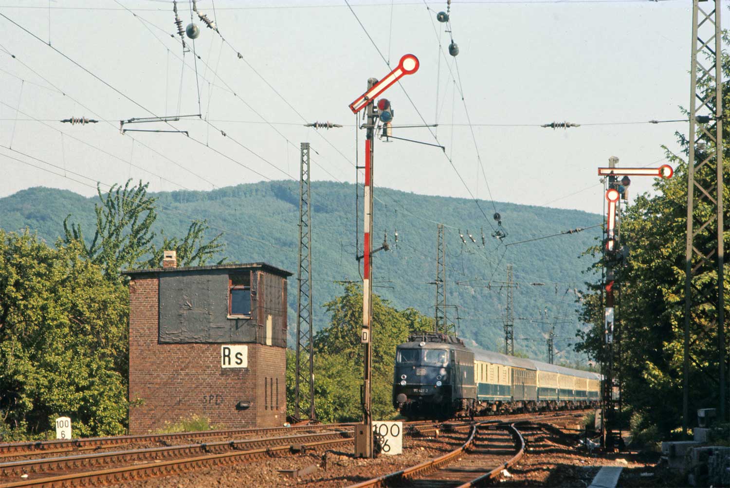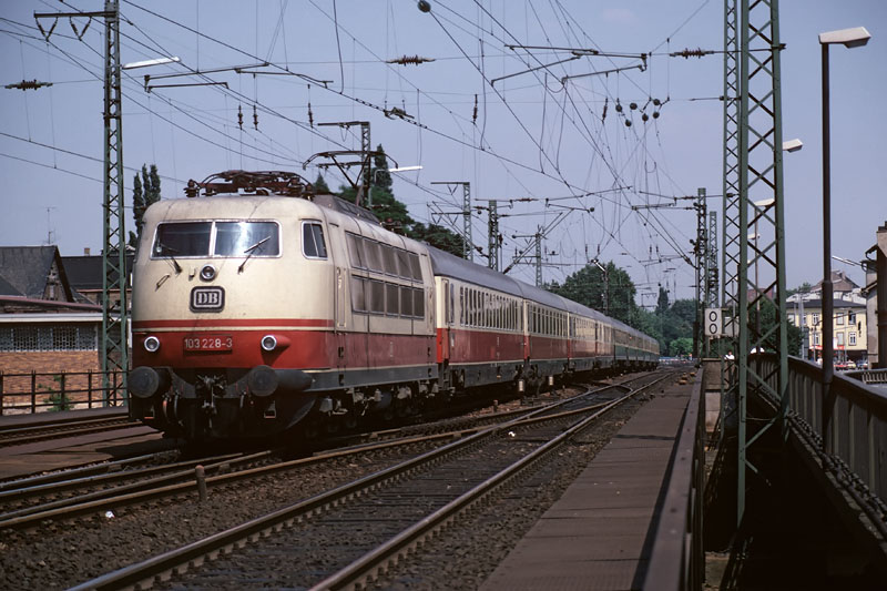 Mitten auf der Nahebrücke (Kilometer-Wechsel 0,0) rollt am 8. Juli 1981 die noch geschürzte 103 228 mit ihrem IC 524 HEINRICH DER LÖWE (München - Braunschweig) Richtung Bingerbrück; das Einfahrtsignal alter Bauart steht noch.