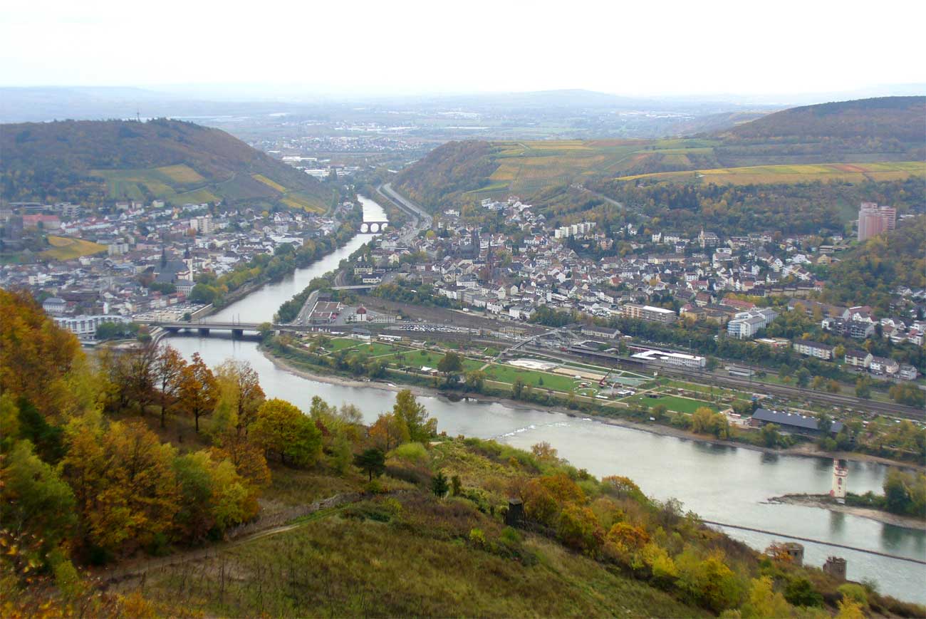 In Bildmitte der Bahnhof Bingerbrück. Rechts am Bildrand der Binger Mäuseturm im