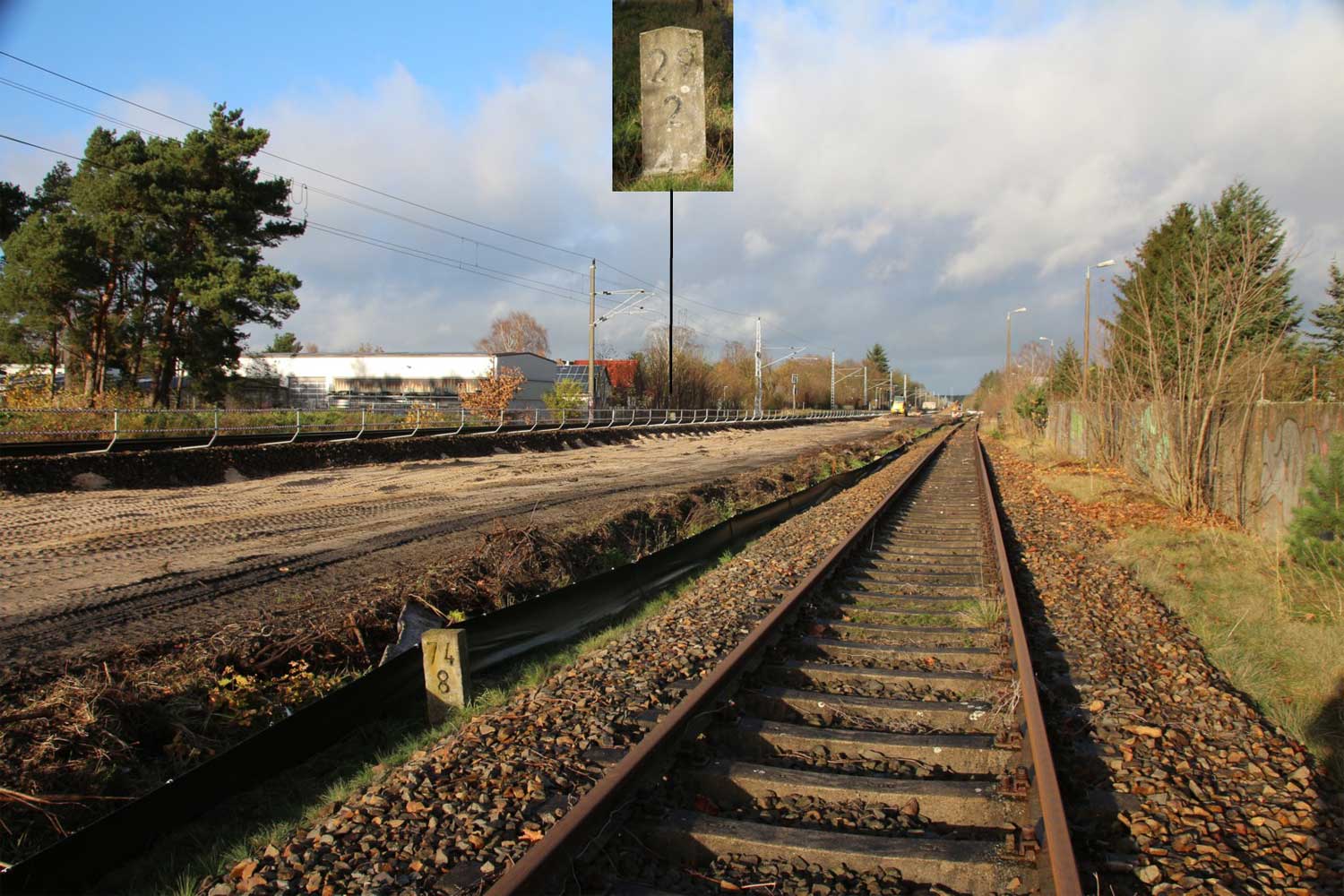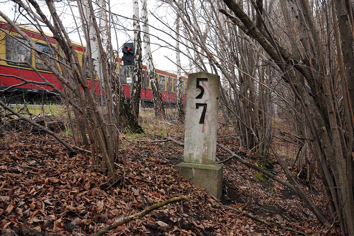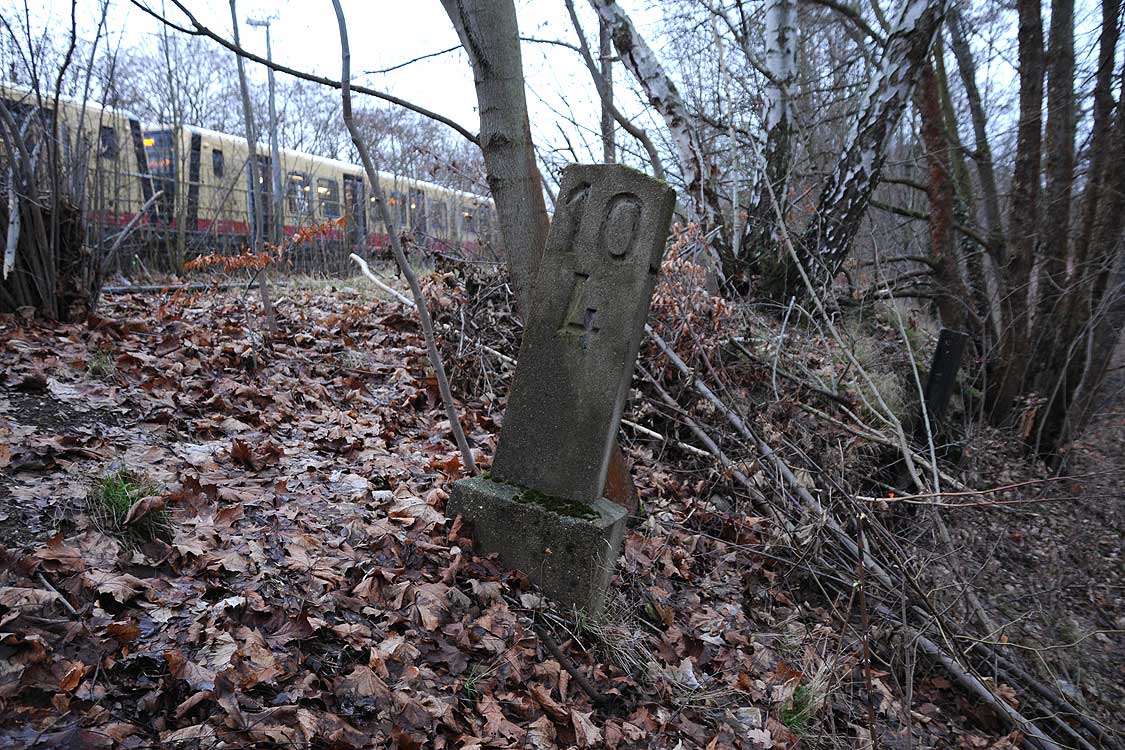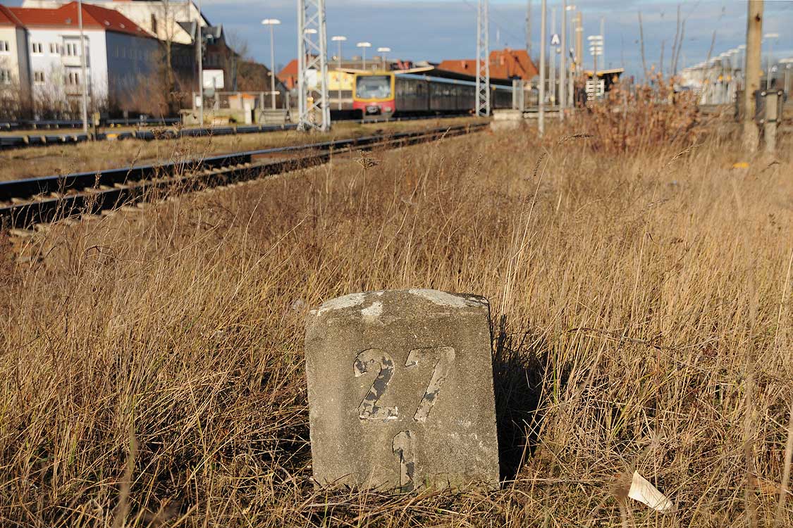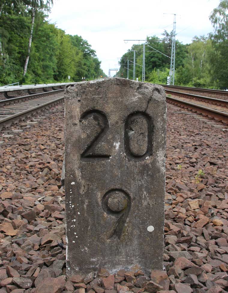 km 29,2 (Stein und Tafel) in Sachsenhausen (Nordbahn) - Blick Richtung Berlin