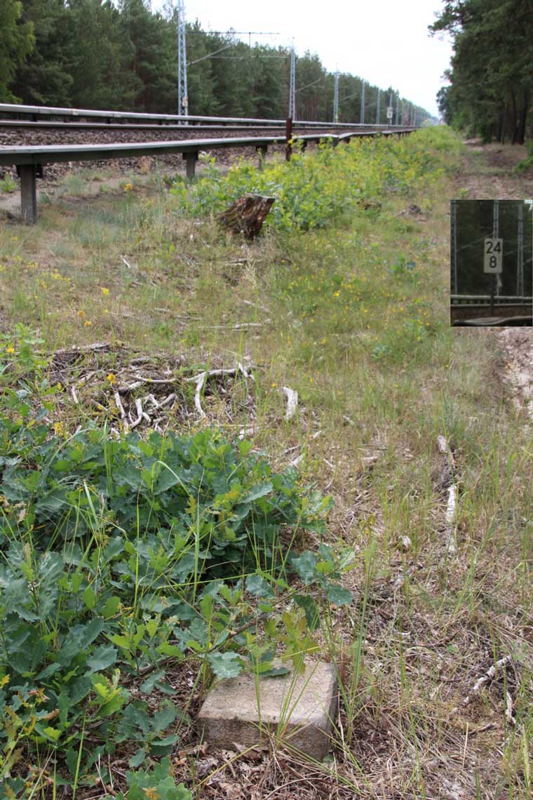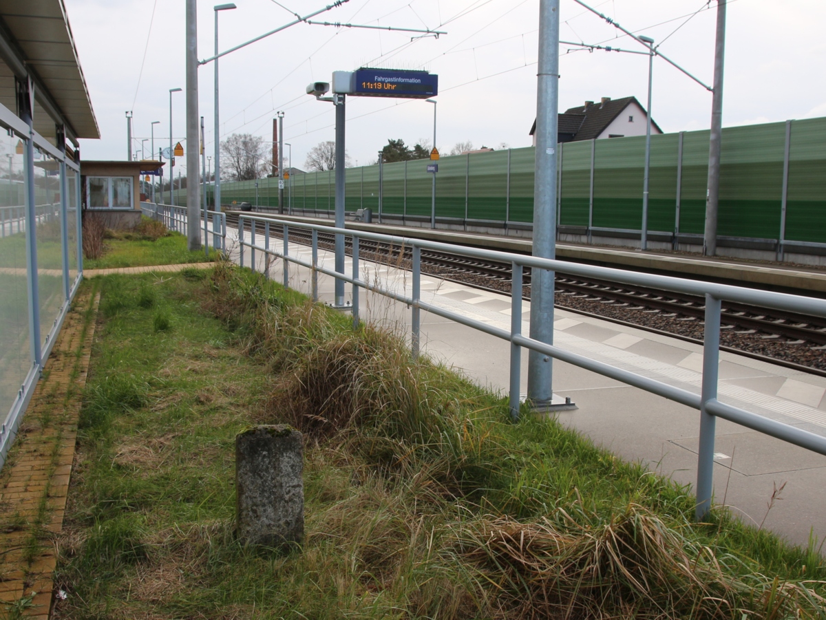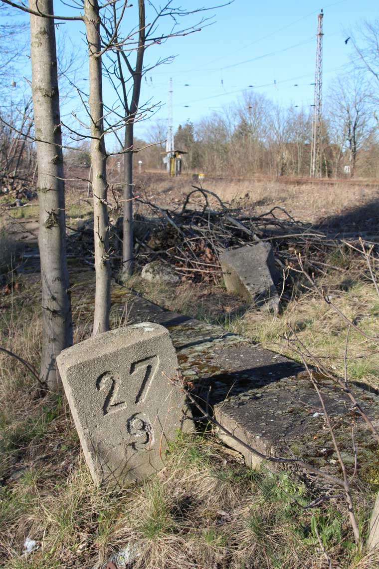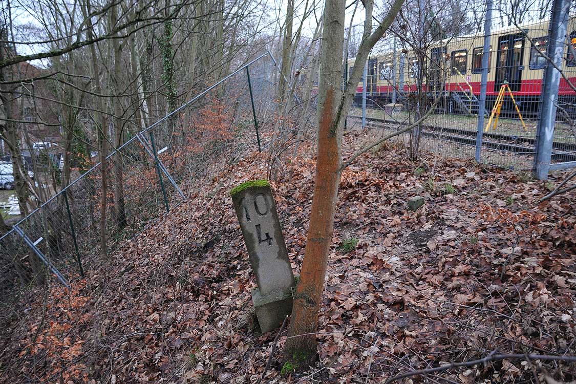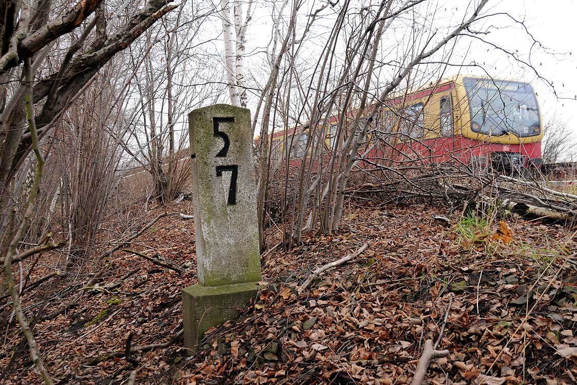 km 29,2 (Stein und Tafel) in Sachsenhausen (Nordbahn) - Blick Richtung Berlin