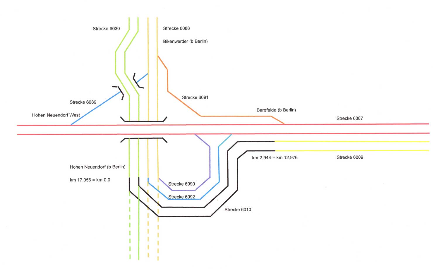 ► | km 3,85 der abgehenden Strecke (Berlin Nordbf -0,02) - Schönholz-Reinickendorf 3,85 - Tegel 10,97 - Velten (Mark) 25,36 - Kremmen 37,24 mit weiterlaufender Kilometrierung (Streckenverzweigung mit gemeinsamen Nullpunkt Berlin Nordbf) | |
