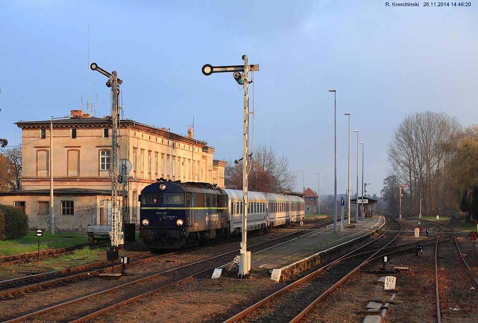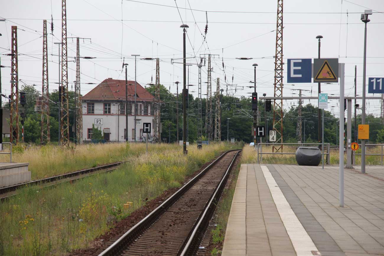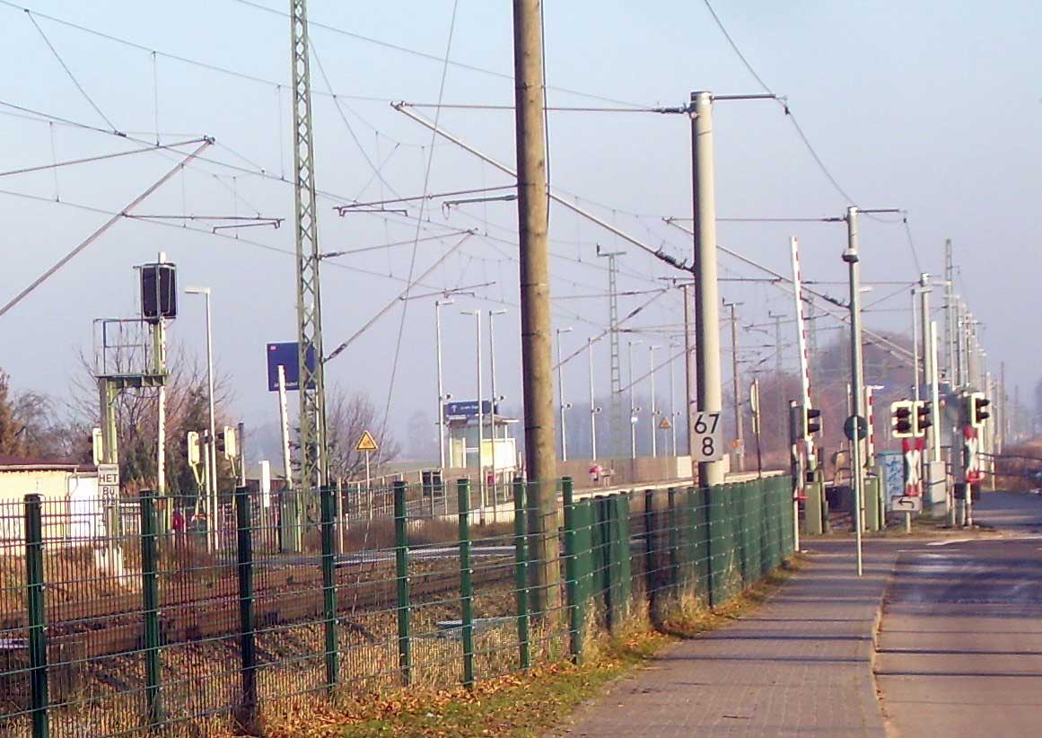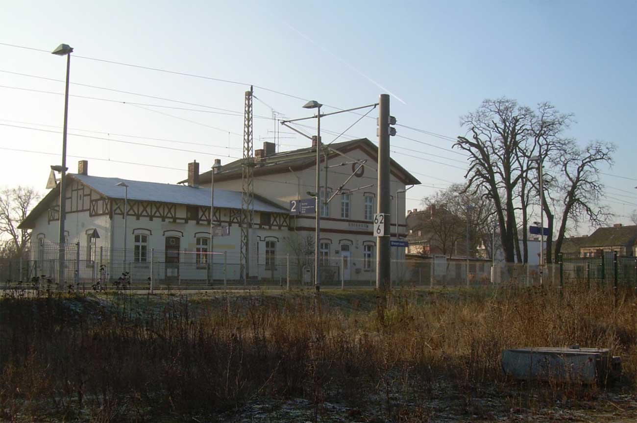 km 152,85 der Strecke Großenhain Cottb. Bf 0,0 - Senftenberg 45,29 - Cottbus 79,67 - Frankfurt (Oder) Pbf 152,85 (Personenzuggleise)/152,79 (Güterzuggleise) | ||