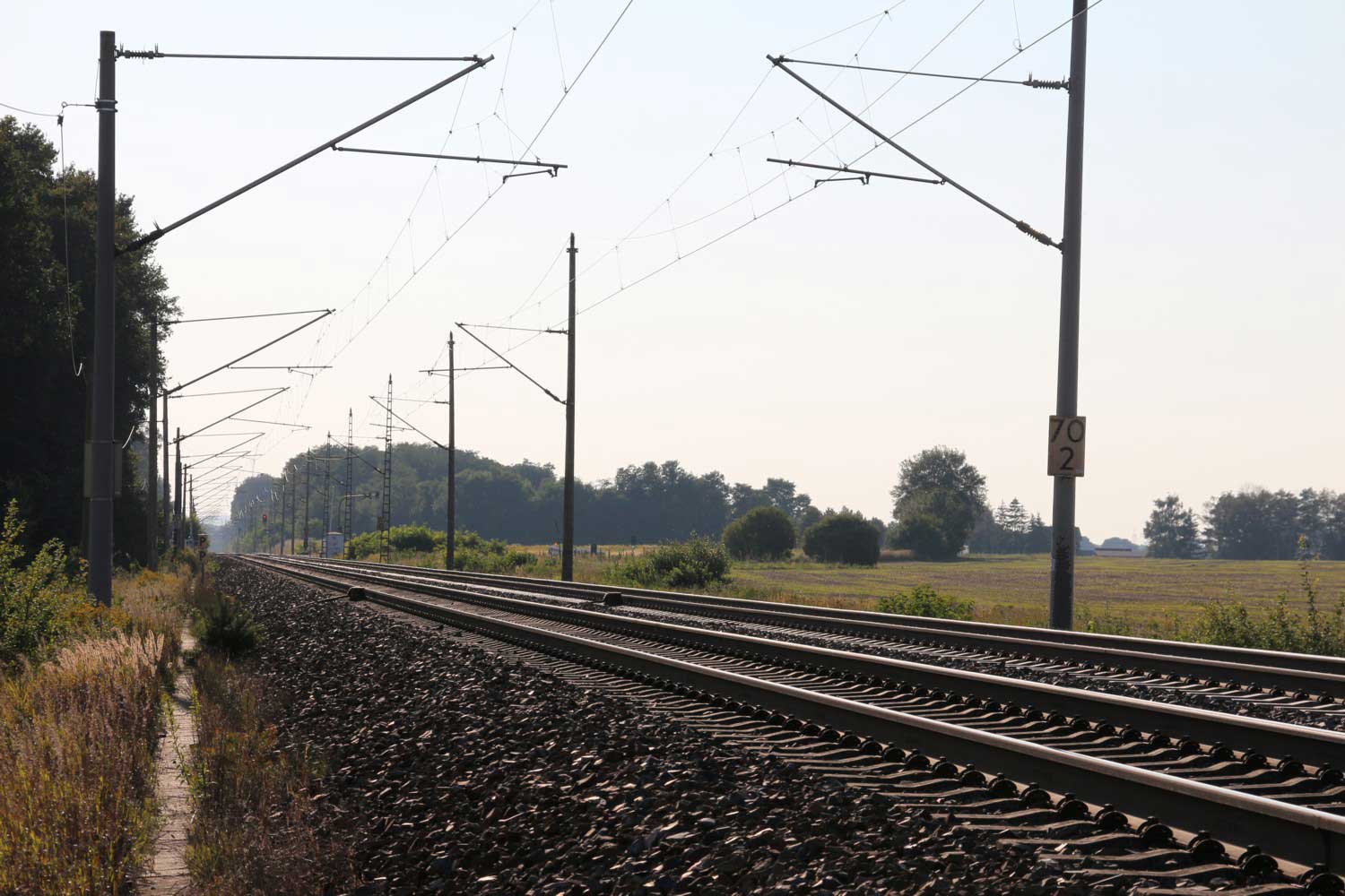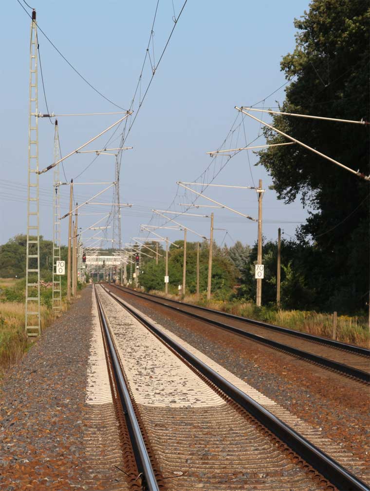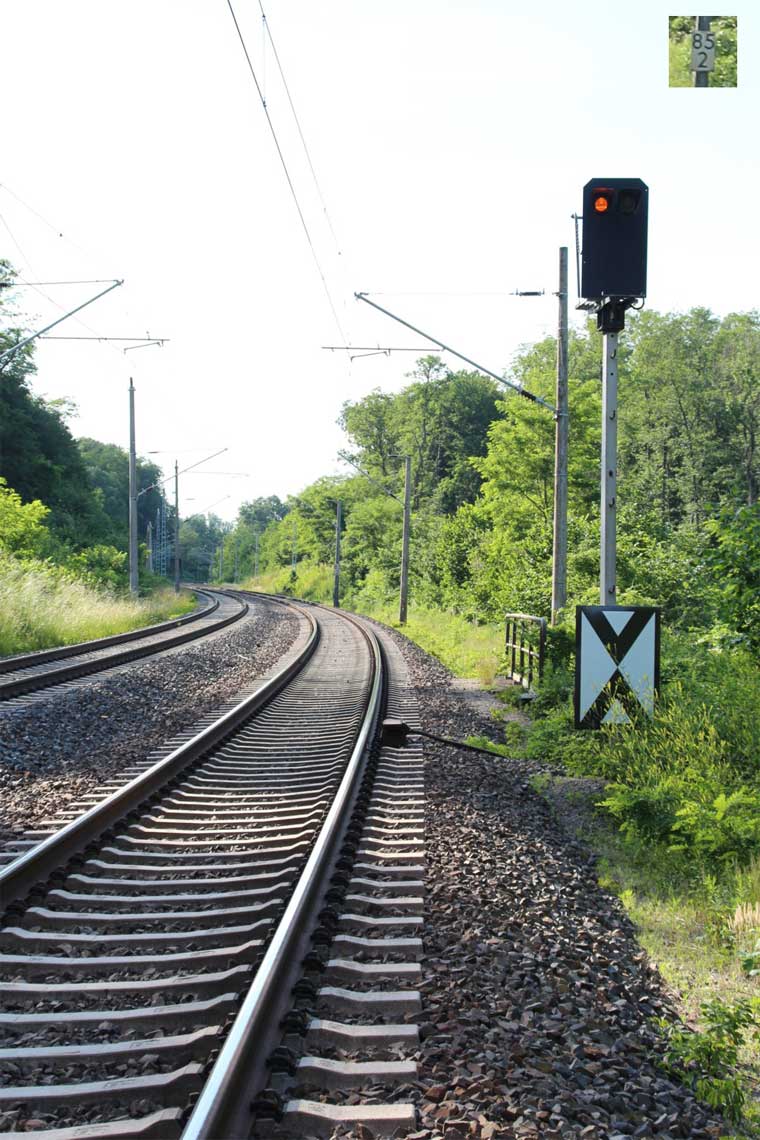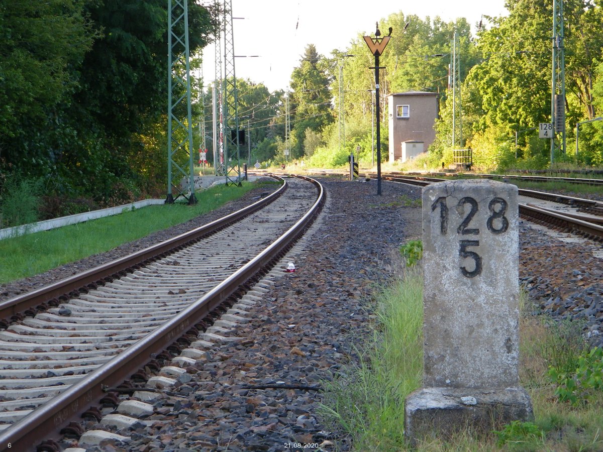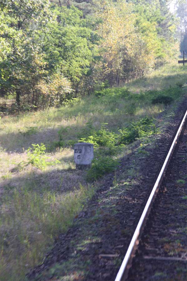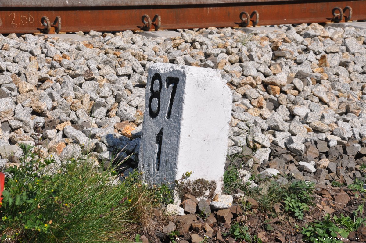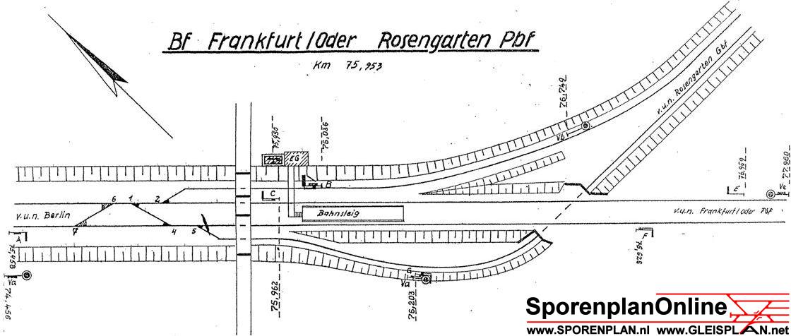 ► | km 75,95 der abgehenden Strecke (Berlin Schlesischer Bf 0,10) - Rosengarten (Kr Lebus) 75,95 - Frankfurt (Oder) Vbf 81,50 mit weiterlaufender Kilometrierung (Streckenverzweigung mit gemeinsamen Nullpunkt Berlin Schlesischer Bf) | |
