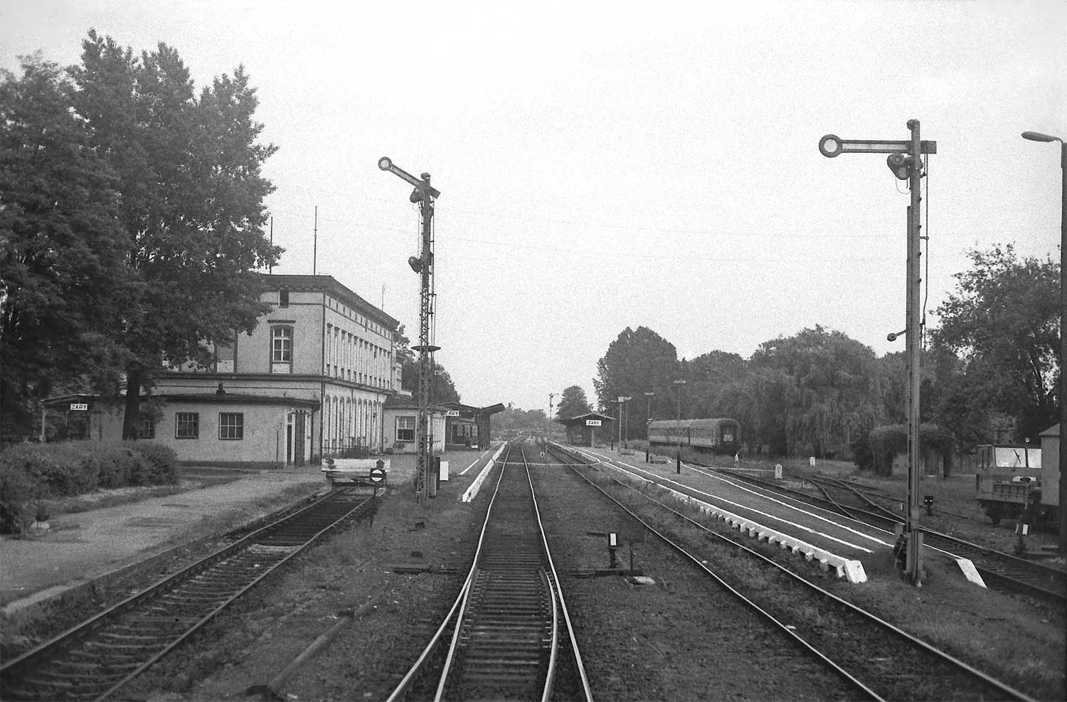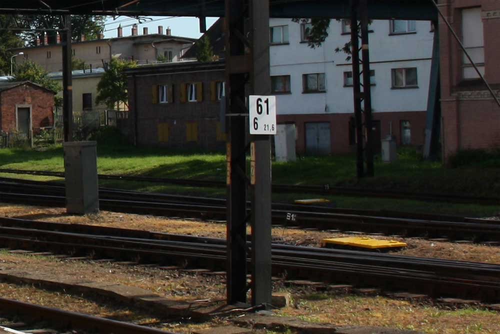 km 0,0 der Strecke Frankfurt (Oder) Hbf 0,0 - Reppen 21,22 - Schwiebus 74,67 - Neubentschen 96,38 - Rbd Grenze Osten/Posen 99,90 - Bentschen 102,572 - Oppenbach 138,637 - Posen (Warthel) Hbf 177,398 | ||