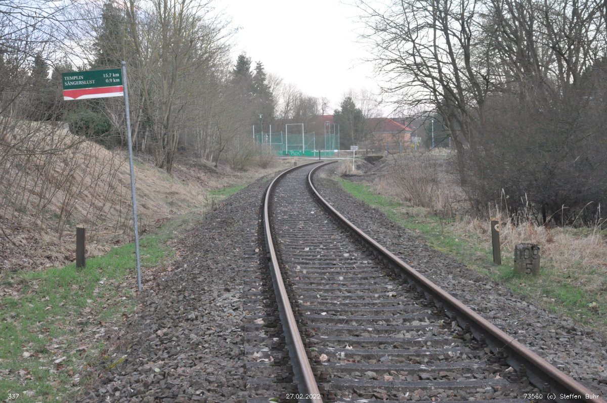 | Templin Vorstadt | 91,30 | km 78,70 der Strecke (Berlin Eberswalder Straße 0,01) - Löwenberg (Mark) 44,25 - Templin 77,32 - Fährkrug 82,30 - Prenzlau 119,42 |
