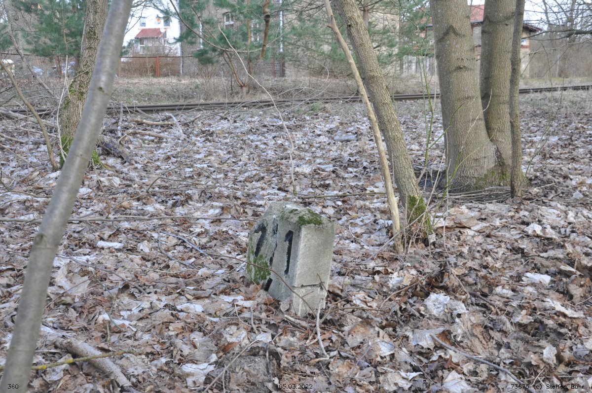 km 50,02 der abgehenden Strecke Berlin Nordbf -0,28 - Grenze Berlin West/DDR 2,74 (Streckenunterbrechung) - Berlin-Pankow 5,60 - Angermünde 70,67 - Grenze DDR/Polen 119,585 = km 10,069 - Szczecin Główny (Stettin Hbf) 0,063 mit weiterlaufender Kilometrierung (Streckenverzweigung mit gemeinsamen Nullpunkt Berlin Stettiner Bf)