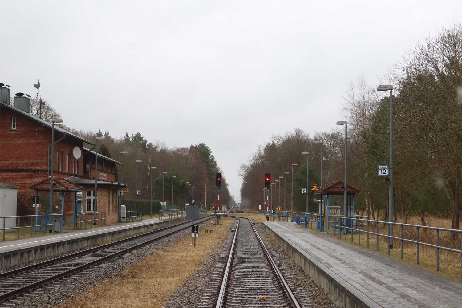 Links vom Empfangsgebäude an der Weiche 25 liegt km 192,0 der Strecke nach Wolgast.