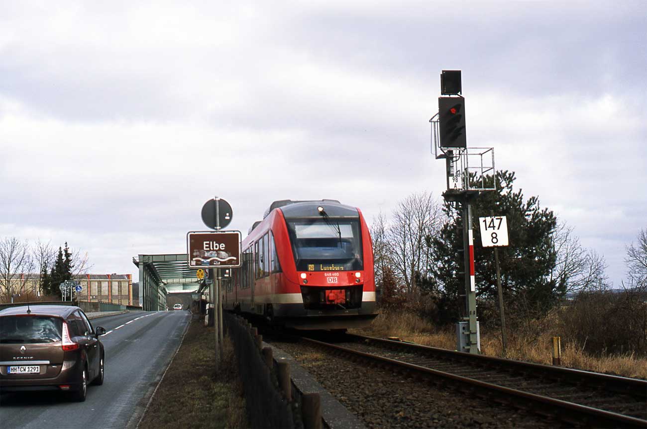 km 147,8 an der Elbbrücke bei Lauenburg (Elbe) - 648 460 als RE 21819