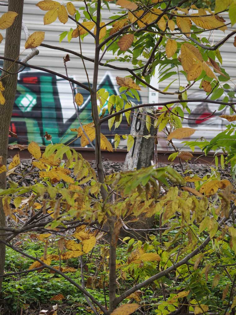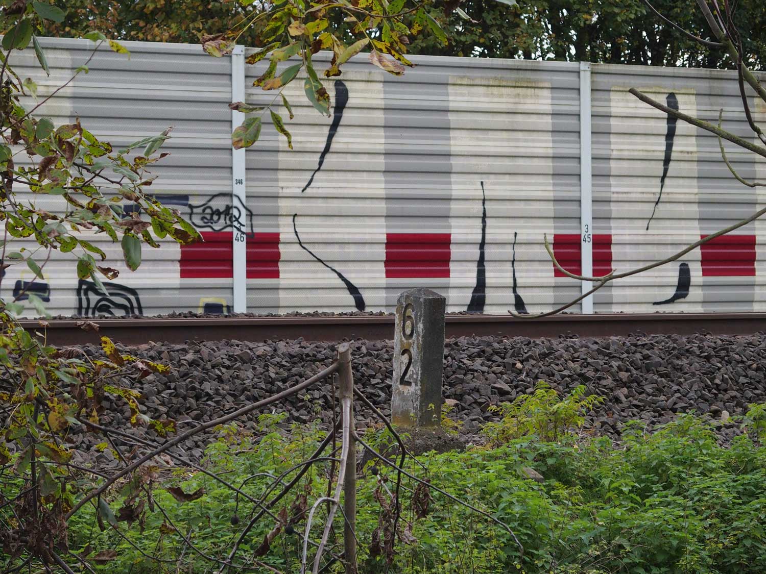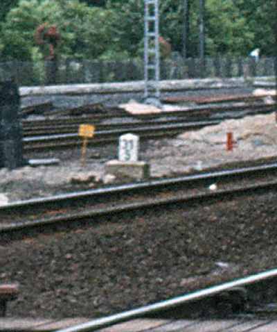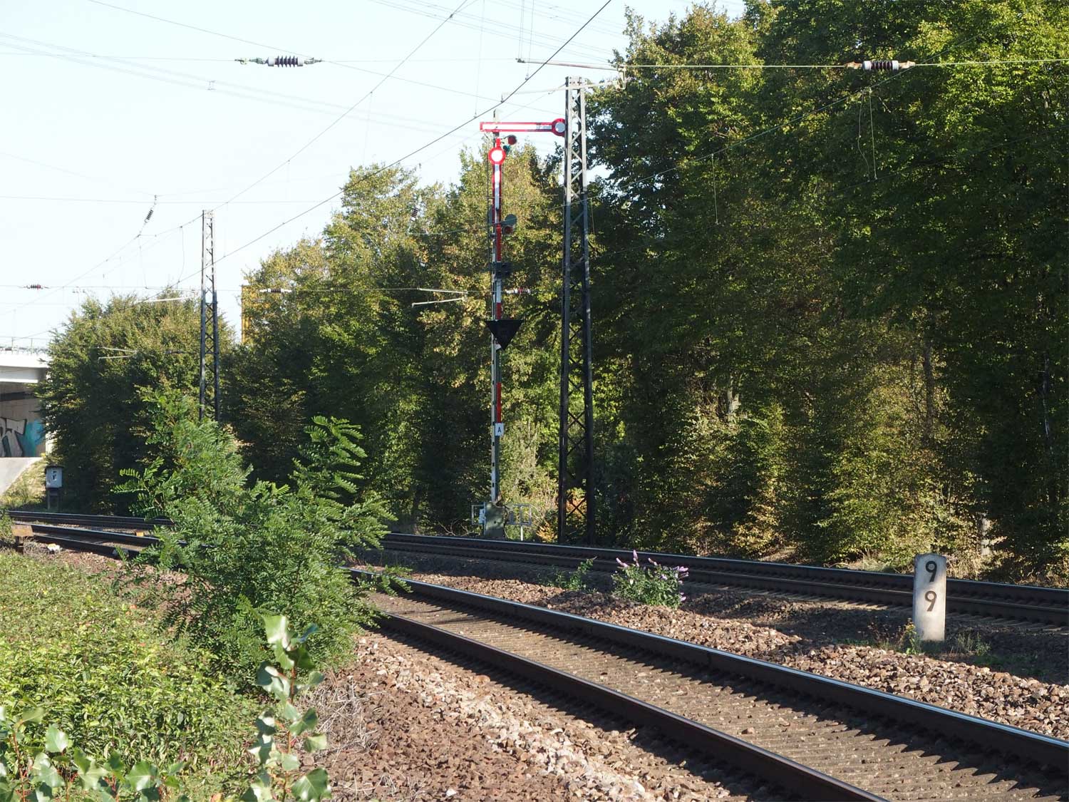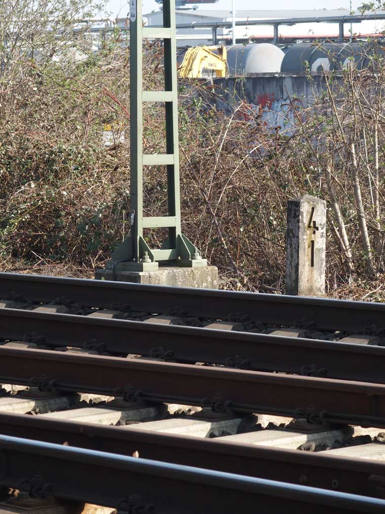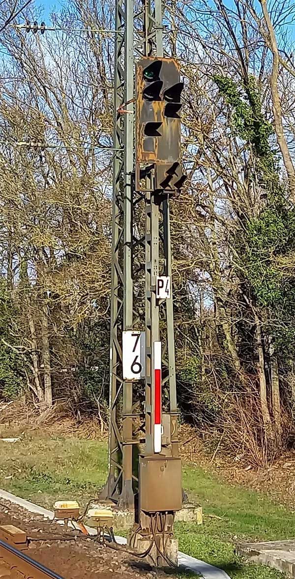 km 36,1 (Stein) hat sich etwas hinter dem Pfosten der Vorsignalbake versteckt