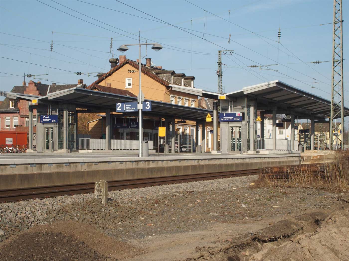 | ► | km 7,78 der abgehenden Strecke (Mainz Hbf 0,0) - Darmstadt Hbf 33,38 (kommend von Mainz Hbf)/34,54 (kommend von Mainz Hbf Gegengleis)/33,96 (gehend nach Aschaffenburg) - Aschaffenburg Hbf 77,718 mit Zweigstrecke von Abzw. Stockschneise 29,68 nach östlich Darmstadt-Kranichstein 35,78 (=41,30 der Hauptstrecke) mit weiterlaufender Kilometrierung (Streckenverzweigung mit gemeinsamen Nullpunkt Mainz Hbf) | |