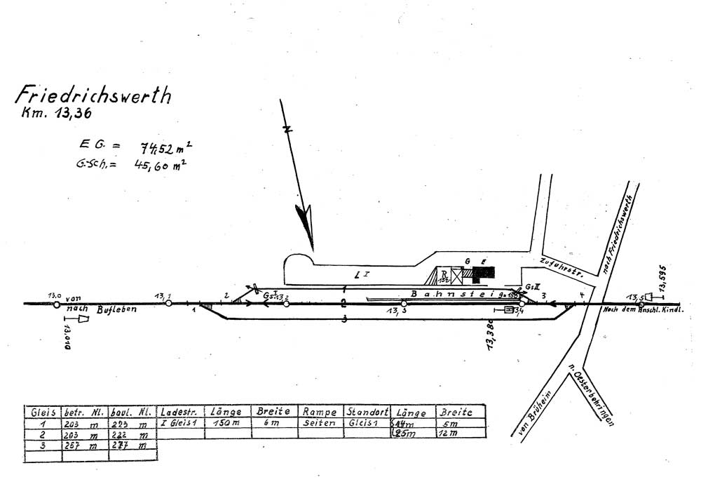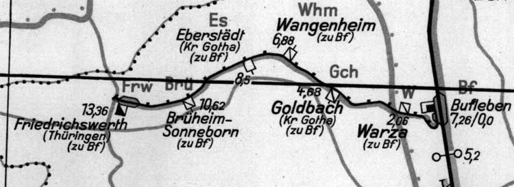 Bufleben - Friedrichswerth (Thür) - [Anschlussbahn zum Flugplatz Kindel] | 13,36 km [ca. 18 km] | Eröffnung: 10.10.1954 |