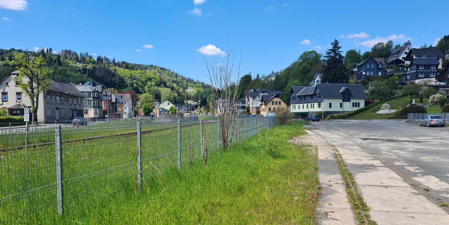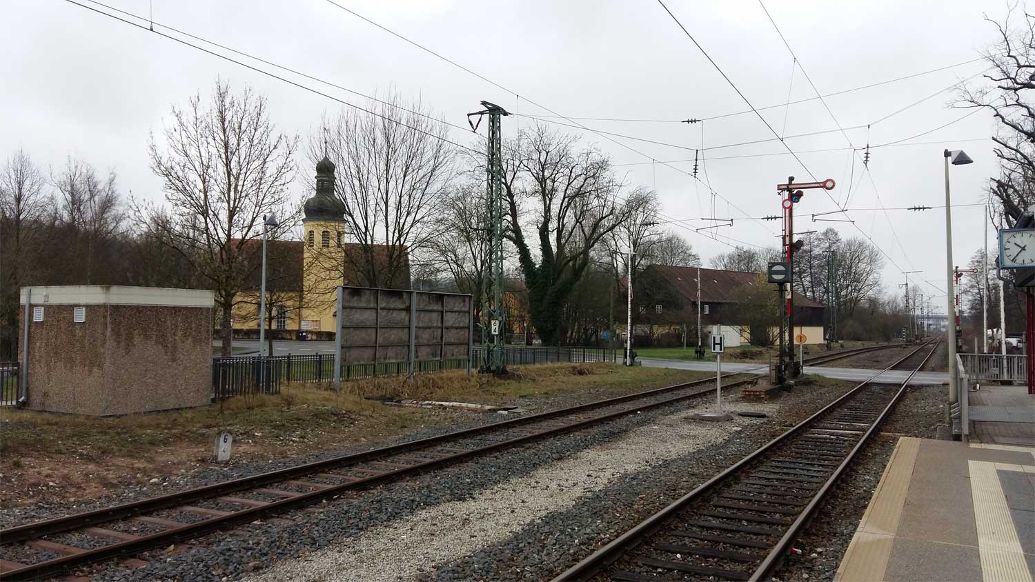 Blick vom Zug aus auf den Bf Lauscha (Thür)