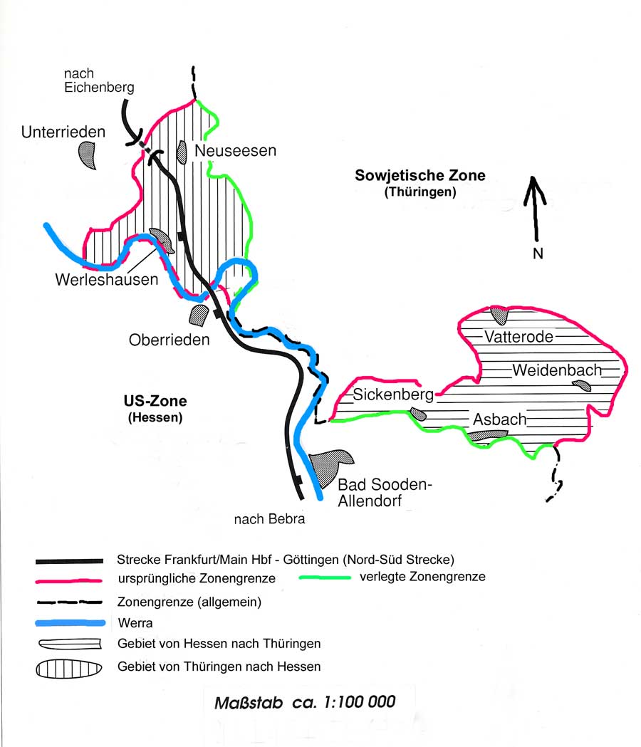 Mit dem Wanfrieder Abkommen vom 17.09.1945 wurde ein Gebietsaustausch zwischen der sowjetischen Zone und der US-Zone entsprechend der unten aufgeführten Karte durchgeführt, so dass die bedeutende Nord-Süd-Strecke nicht mehr durch die sowjetische Zone führte.