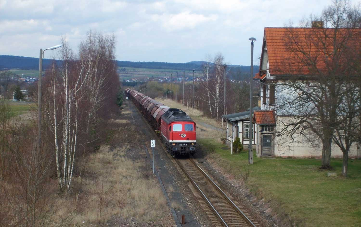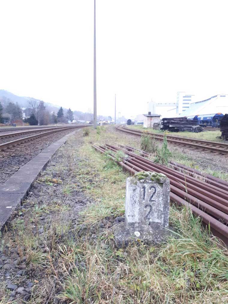 Der Weg ist das ehem. Gleis ins Ulstertal, links davon unter dem Busch das Gleis