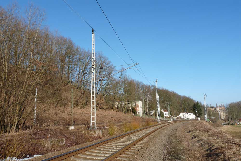 km 11,6 - man beachte den Übergang von der Einfach-Oberleitung auf die Regelbauart mit Tragseil