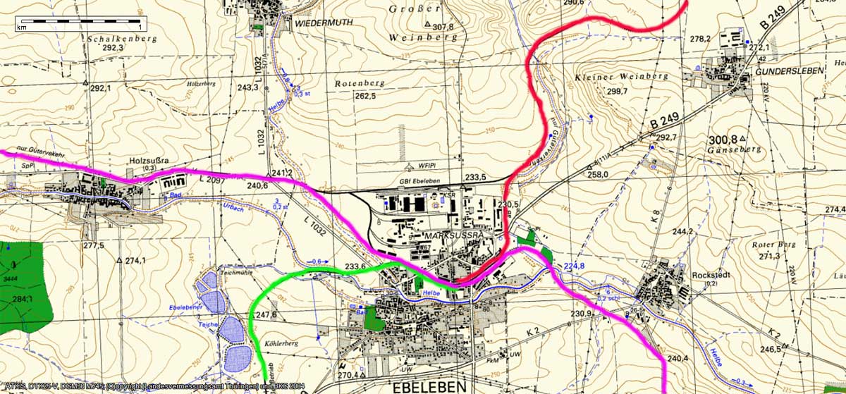 Landesvermessungsamt Thüringen, TK 1:25.000 Lage der Strecken bis Mitte 1970 Rot: Hohenebra - Ebeleben Grün: Ebeleben - Mühlhausen (Thür) Violett: Greußen - Keula (Thür)