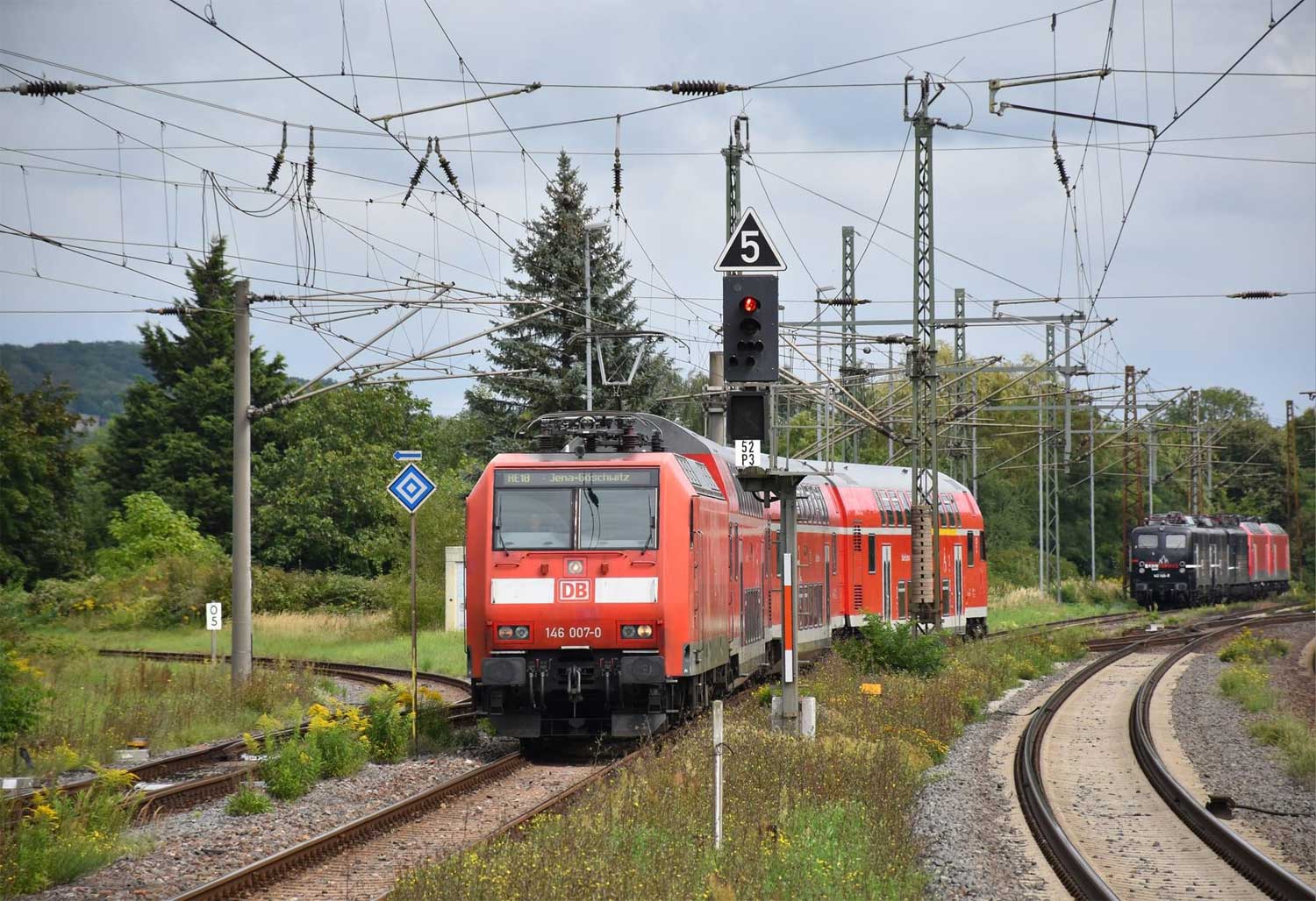 146 007 mit RE 18 befindet sich etwa bei km 45,1 der Strecke