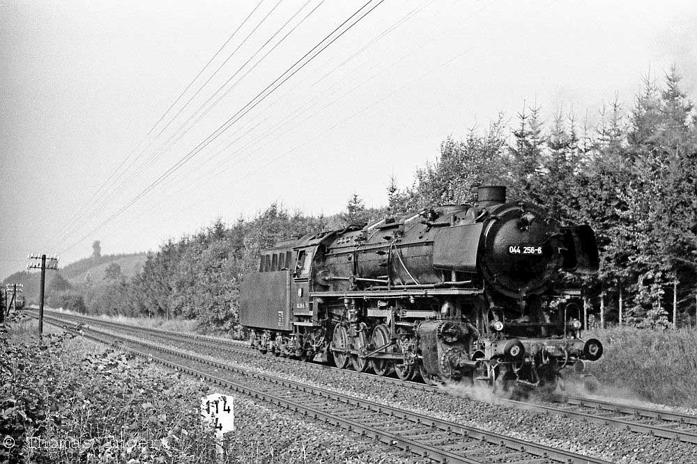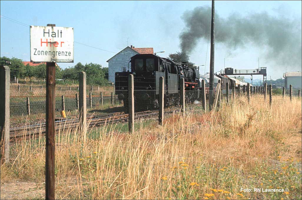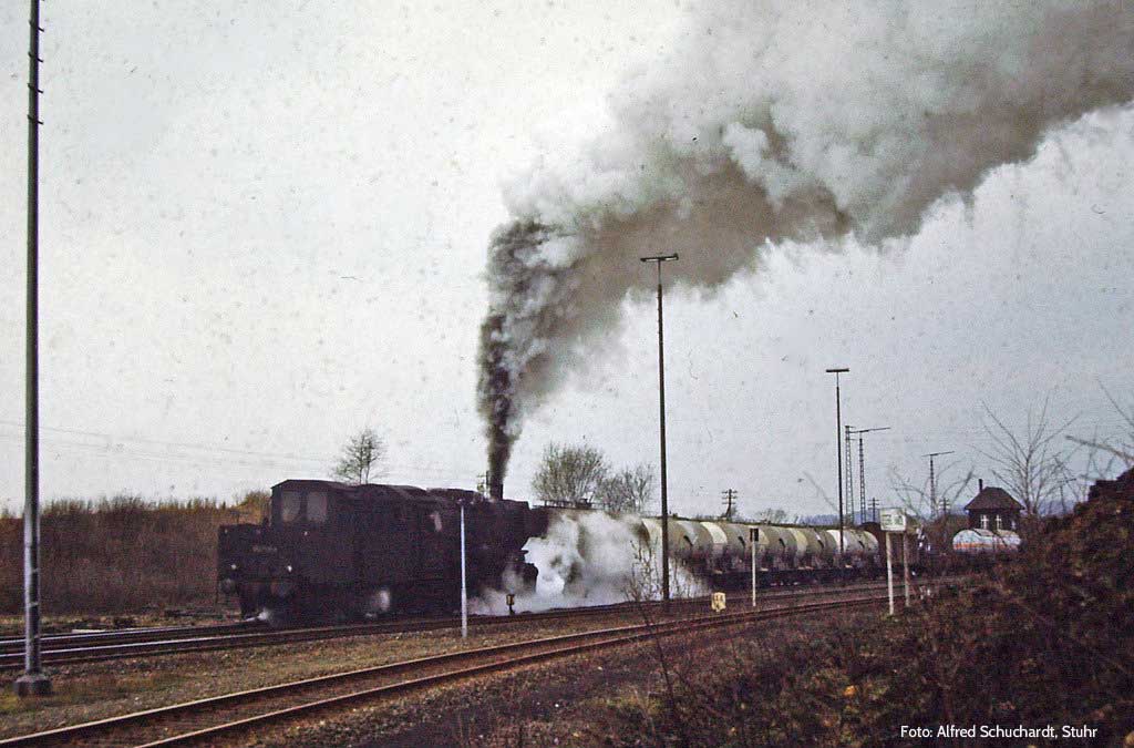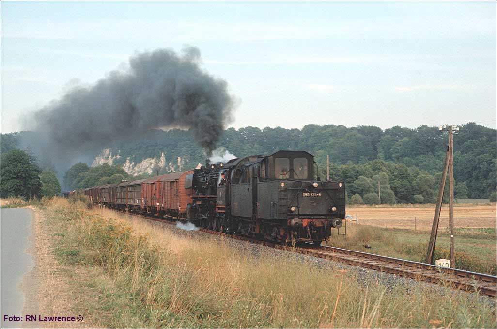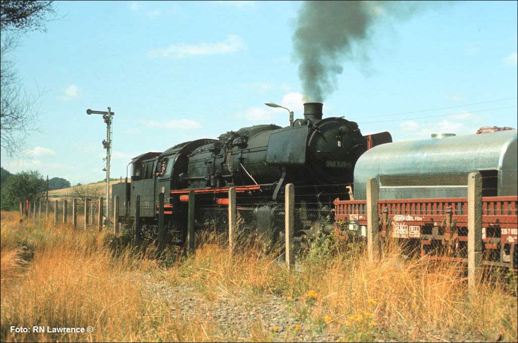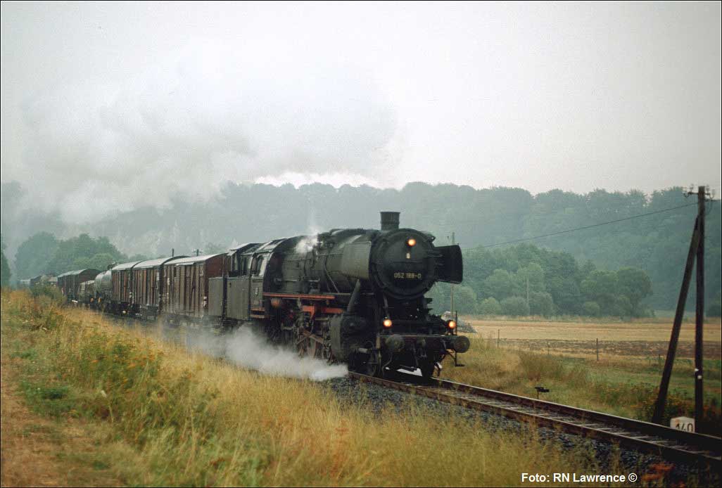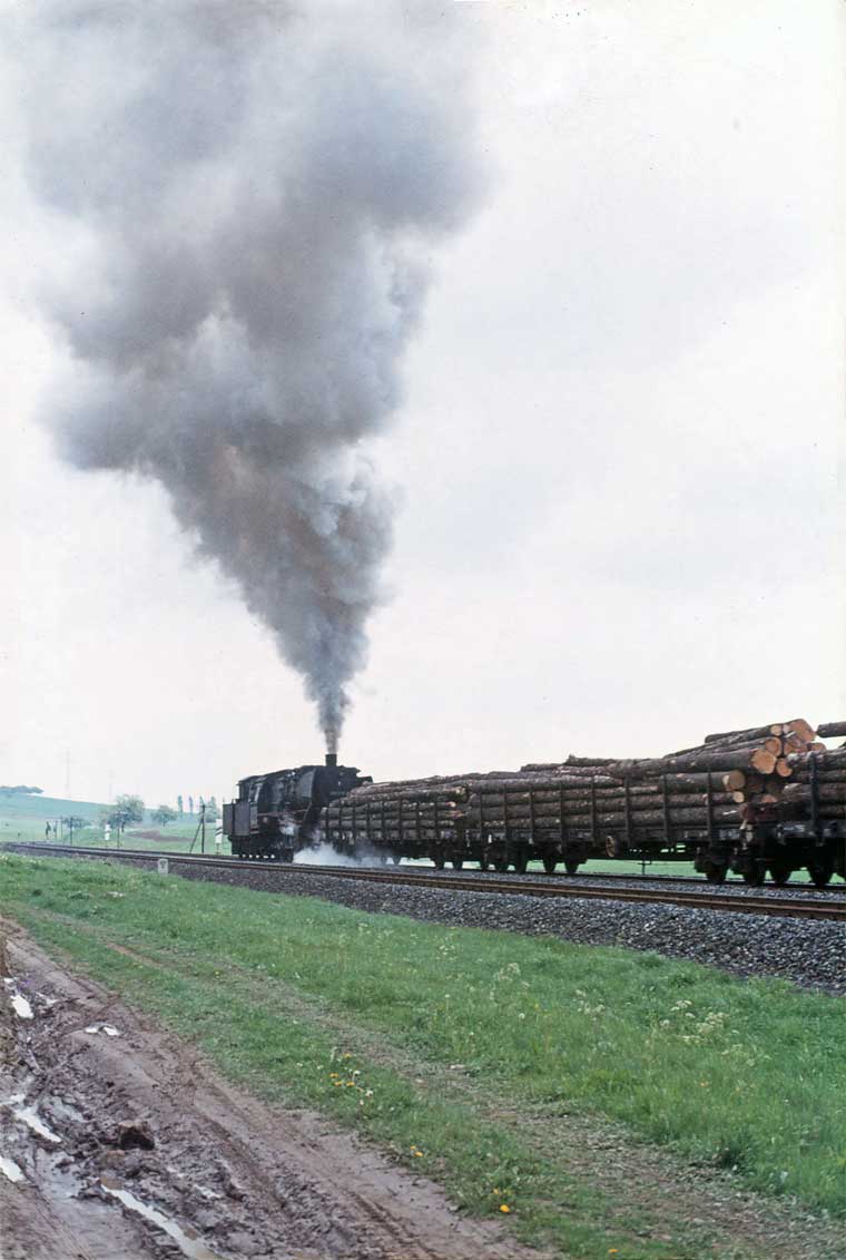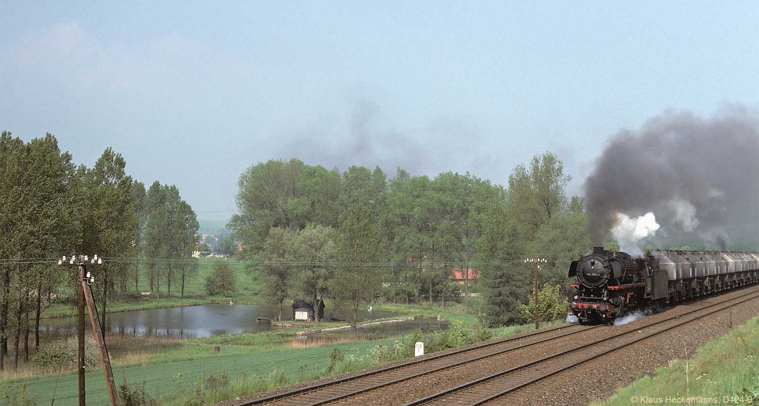 Nur ein kurzes Gastspiel gab die Baureihe 52 im Bw Nordhausen, weil nach der Abstellung der BR 44 nicht genügend Diesellok‘s zur Verfügung standen. Vorwiegend im Güterzugdienst, aber auch vor Personenzügen wurde sie eingesetzt. Im Juni 1983 ist 52 8179 bei Nordhausen Salza mit einem Pz nach Ellrich unterwegs. Am Regler stand Peter „Pollo“ Poloczek. Ihm sei dieses Foto gewidmet, viel zu früh musste er den Führerstand verlassen.