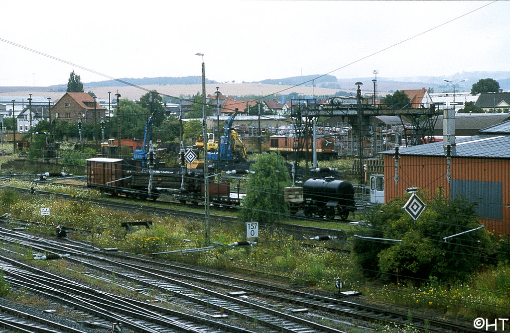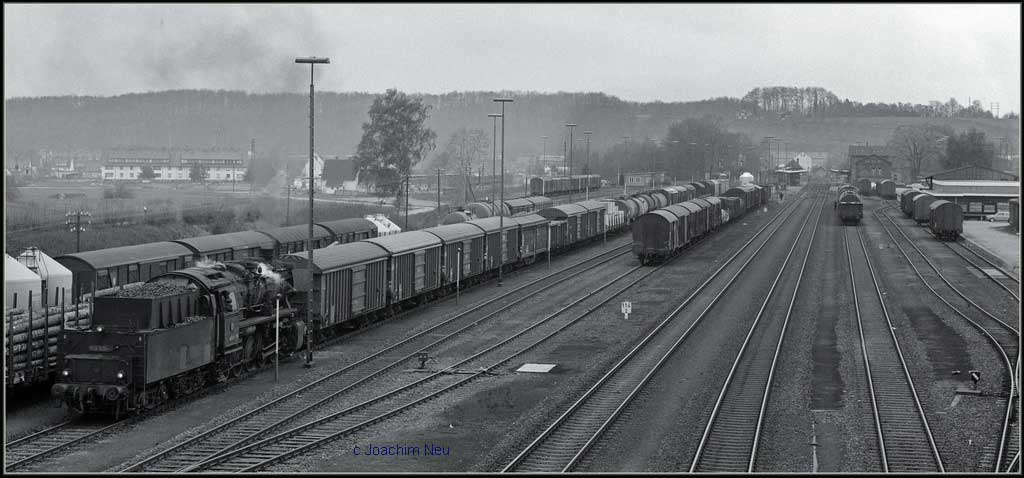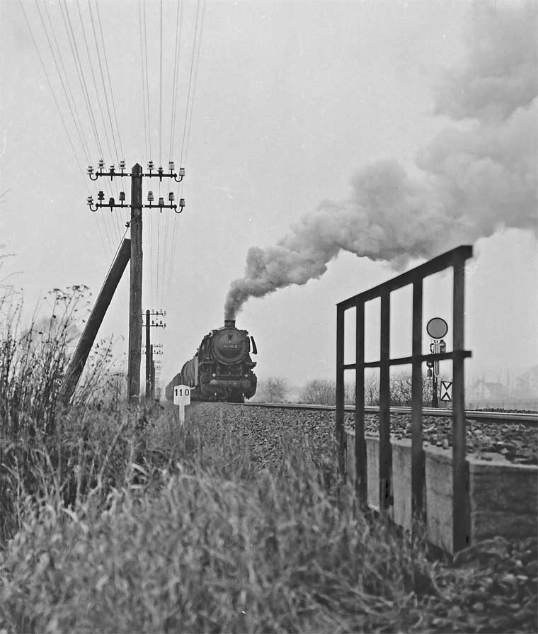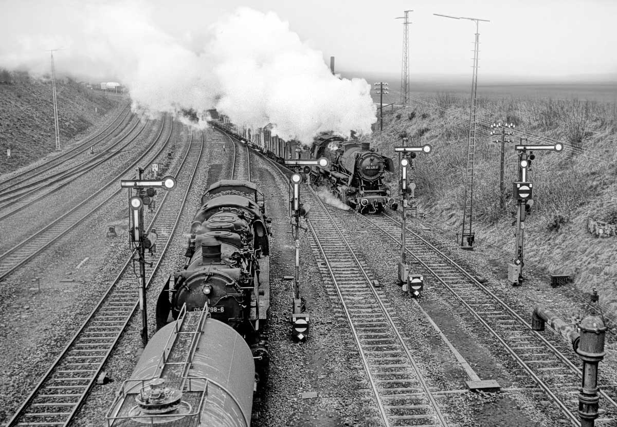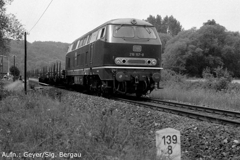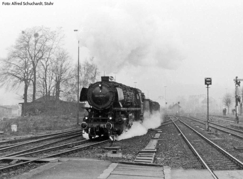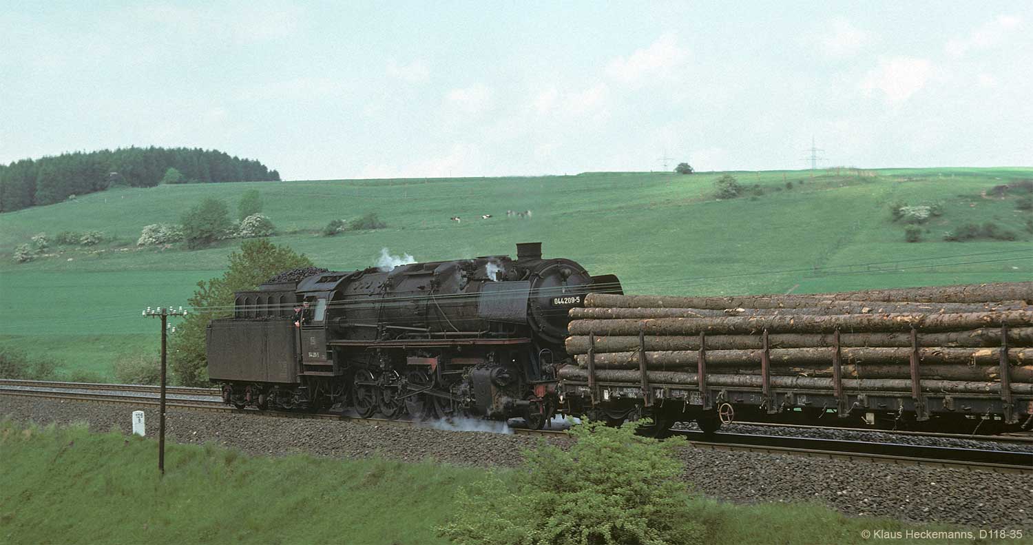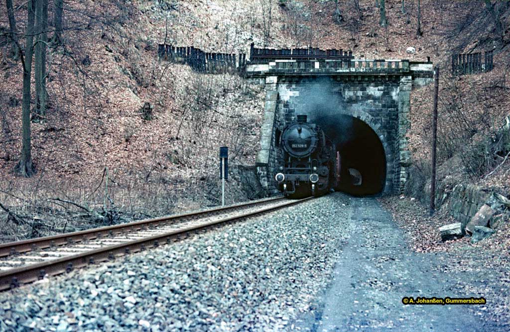 Nur ein kurzes Gastspiel gab die Baureihe 52 im Bw Nordhausen, weil nach der Abstellung der BR 44 nicht genügend Diesellok‘s zur Verfügung standen. Vorwiegend im Güterzugdienst, aber auch vor Personenzügen wurde sie eingesetzt. Im Juni 1983 ist 52 8179 bei Nordhausen Salza mit einem Pz nach Ellrich unterwegs. Am Regler stand Peter „Pollo“ Poloczek. Ihm sei dieses Foto gewidmet, viel zu früh musste er den Führerstand verlassen.