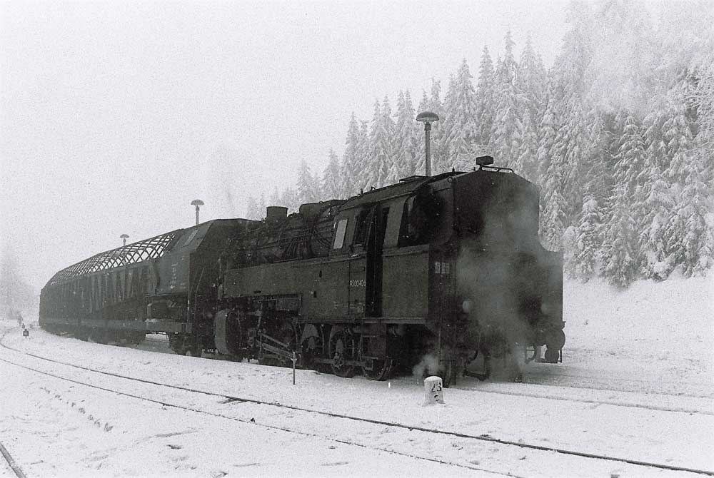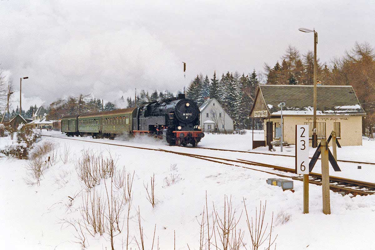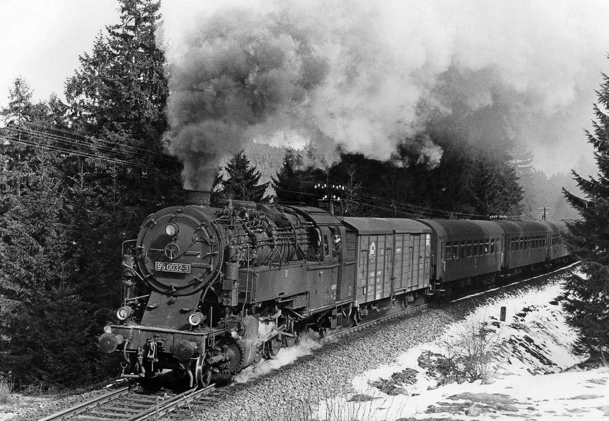 95 0040 mit sowjetischer Schneeräumeinheit SRE 41 am km 23,3 in Ernstthal am Rennsteig