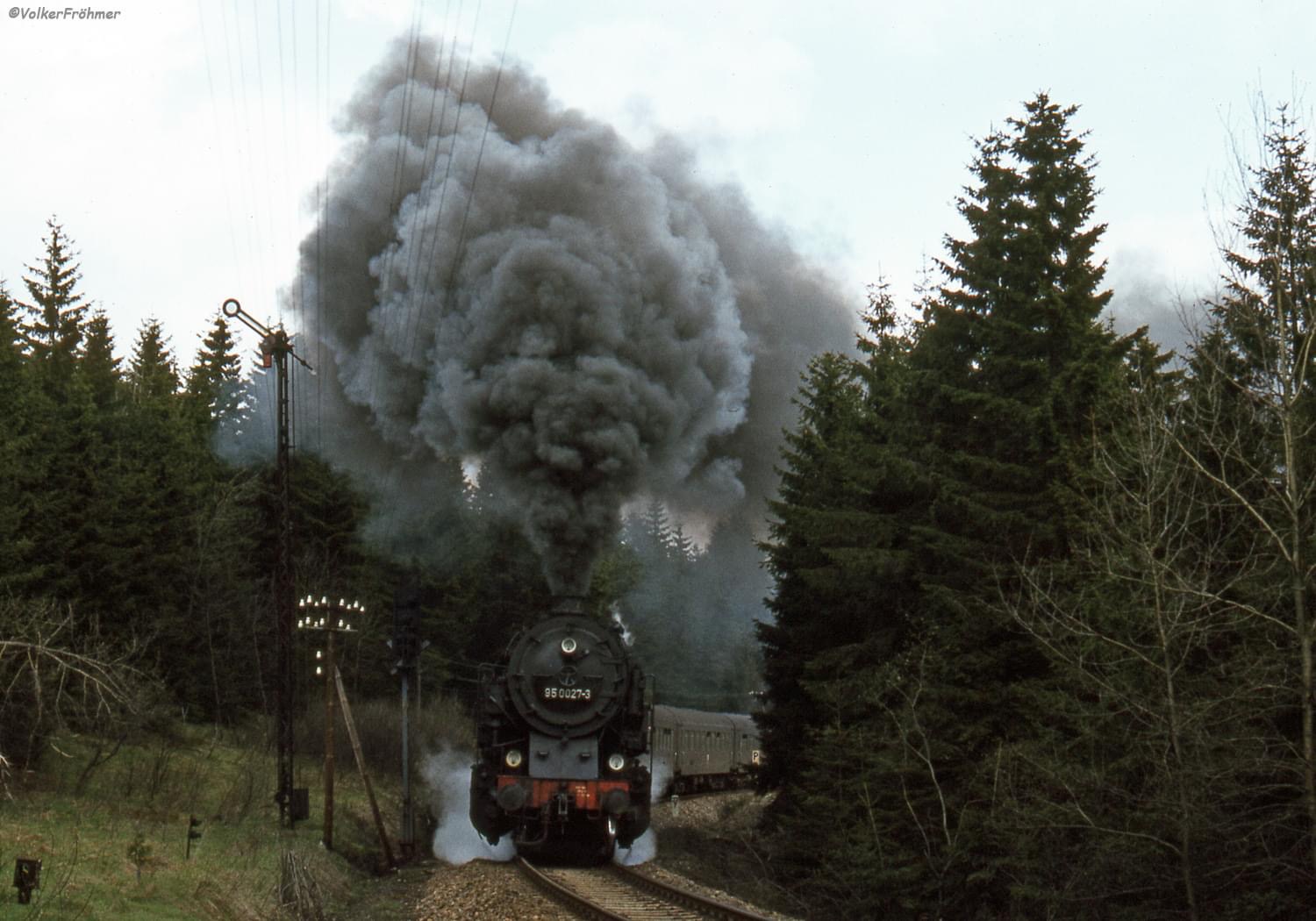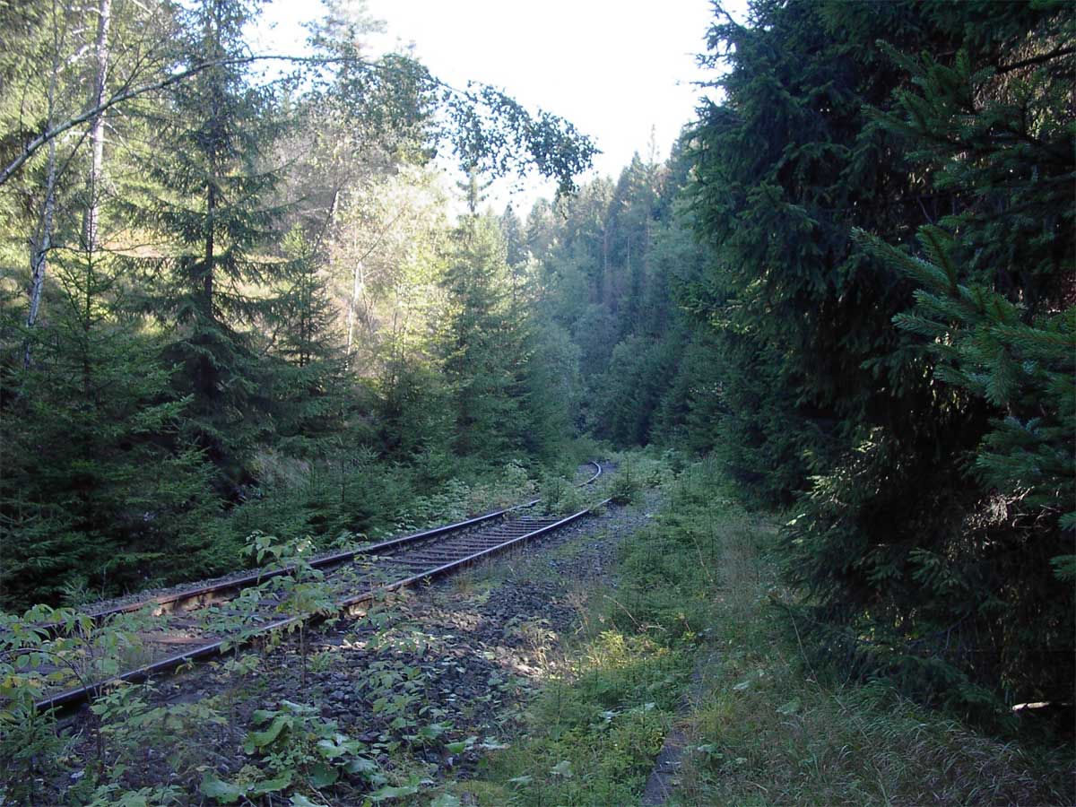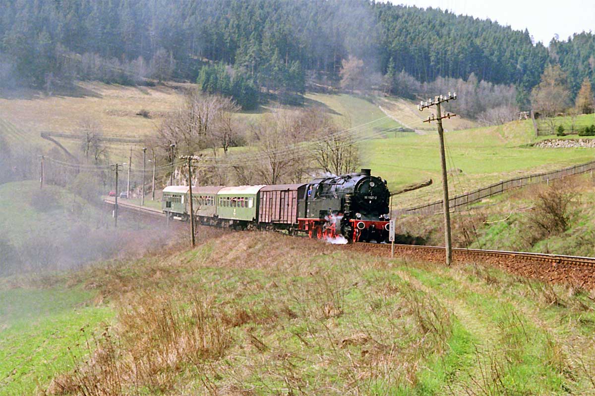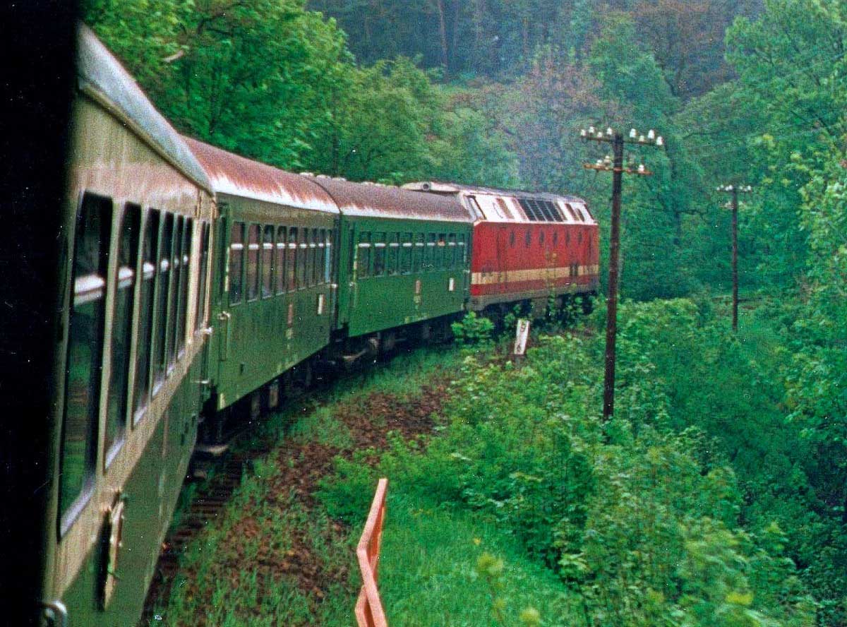 Der Zug kommt aus Ri Gräfenthal. Links das Gleis führt zum Bf Probstzella. Rechts das Gleis war die Verbindungskurve in Ri Saalfeld.