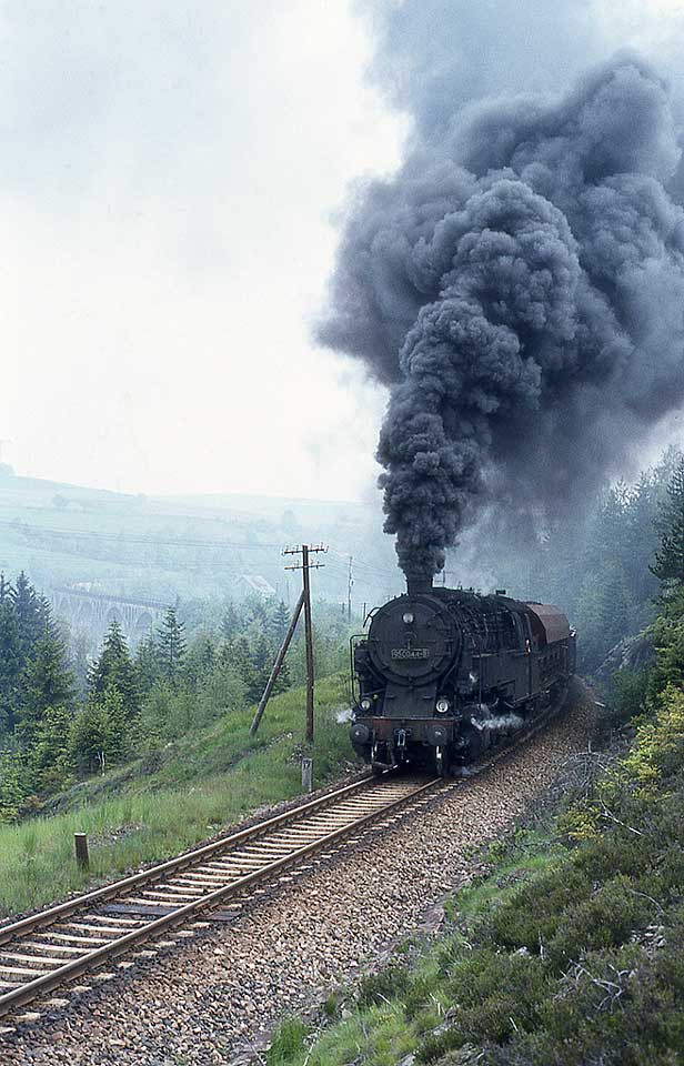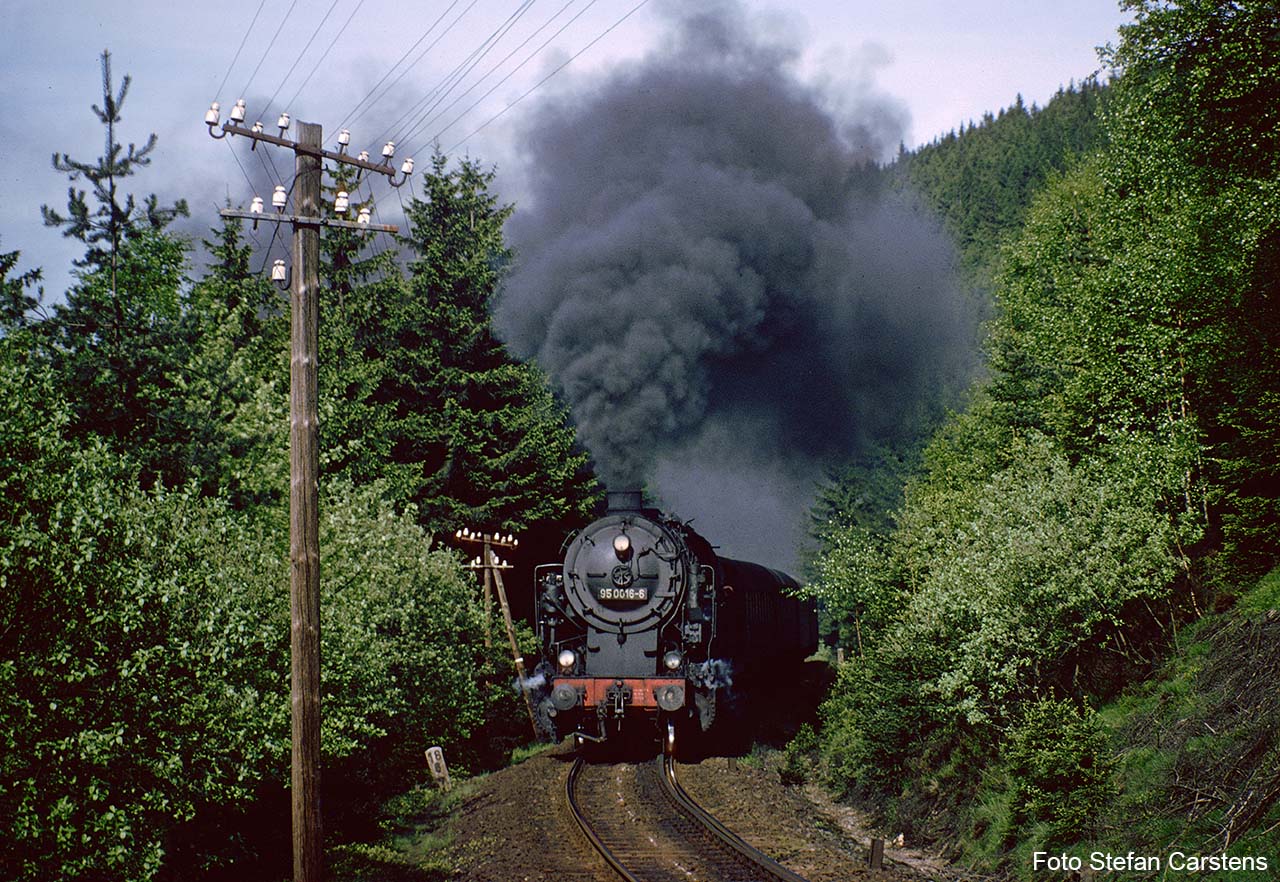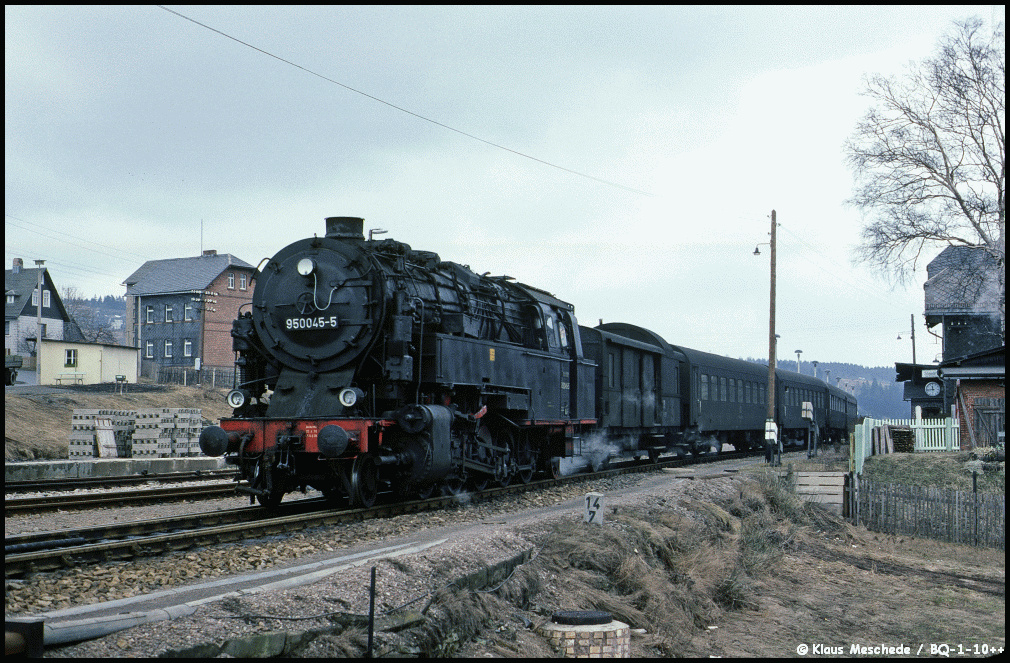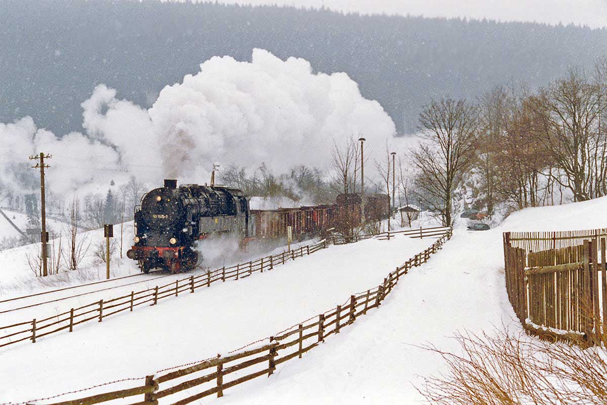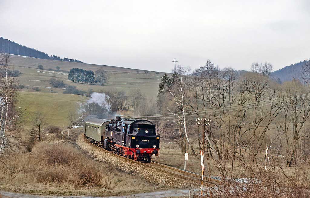 Der Zug kommt aus Ri Gräfenthal. Links das Gleis führt zum Bf Probstzella. Rechts das Gleis war die Verbindungskurve in Ri Saalfeld.