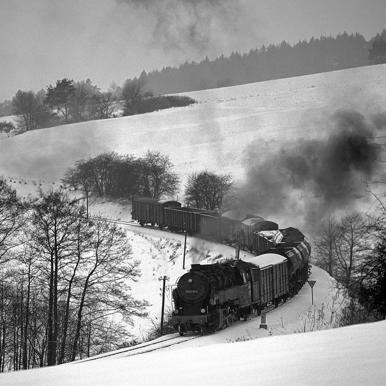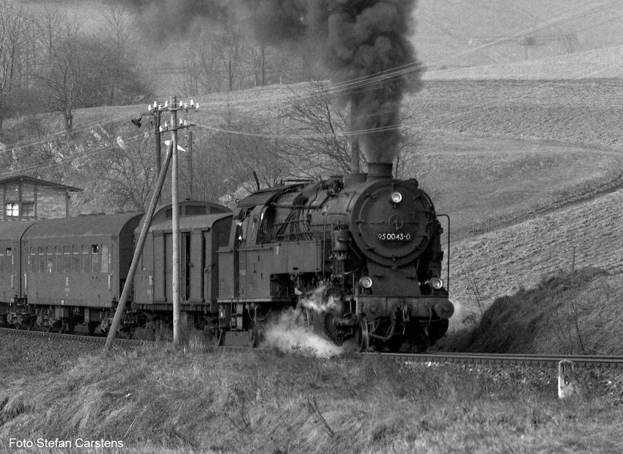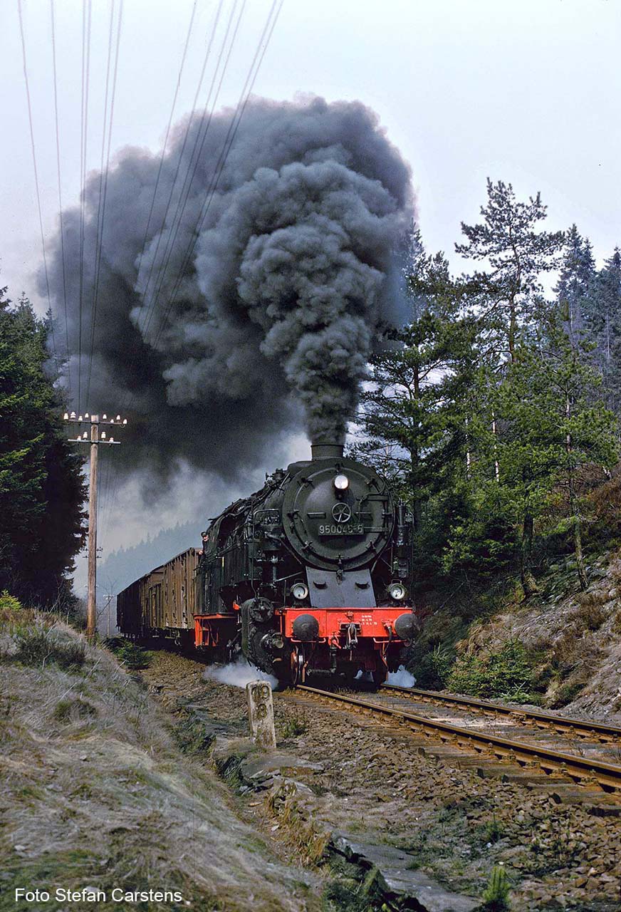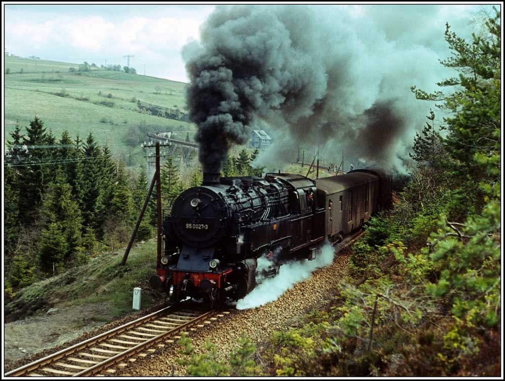95 027 mit Güterzug bei der Ausfahrt im Bf Ernstthal am Rennsteig am km 23,6