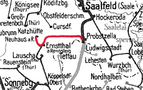 Ernstthal am Rennsteig 23,32 km 45,03 der Strecke Coburg 0,0 - Grenze BRD/DDR 17,20 (Streckenunterbrechung) - Sonneberg (Thür.) 19,51 - Lauscha (Thür) 38,66 - Ernstthal am Rennweg 45,03