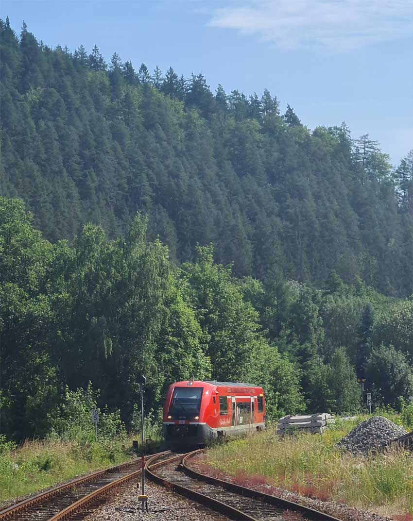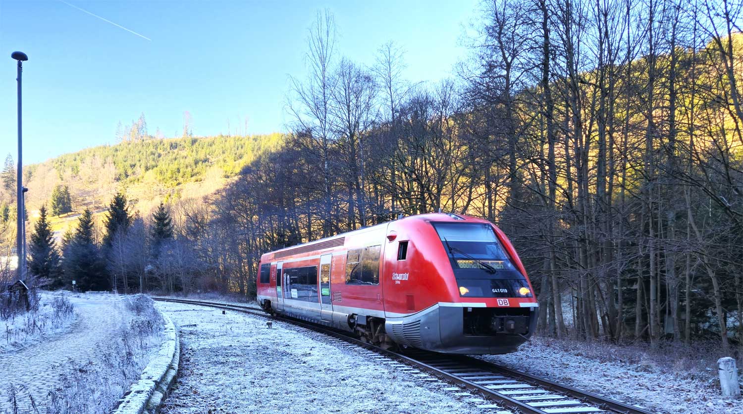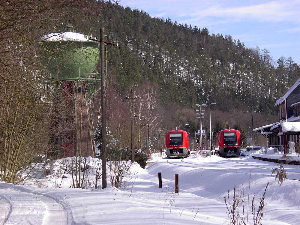 Kreuzung mit zwei Triebwagen der Baureihe 641 im Bf Sitzendorf-Unterweißbach