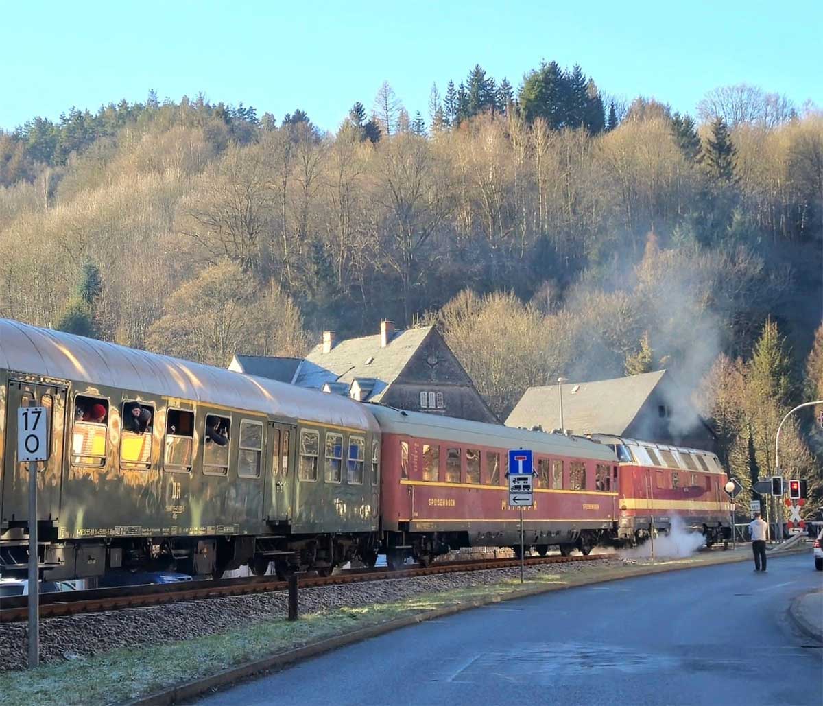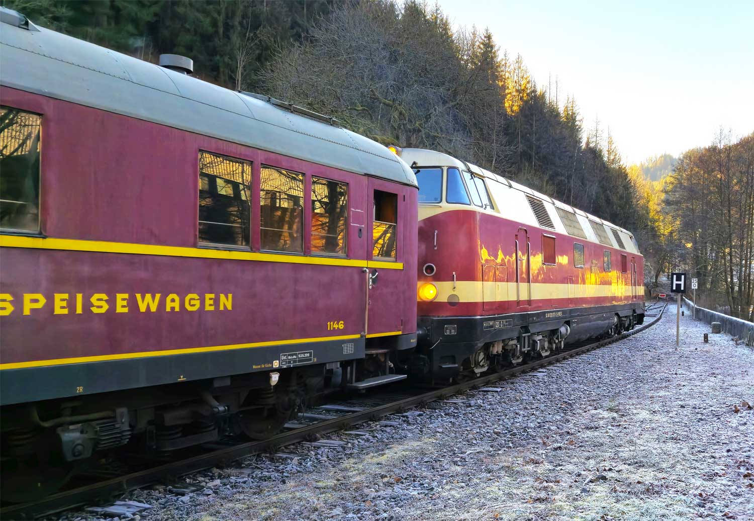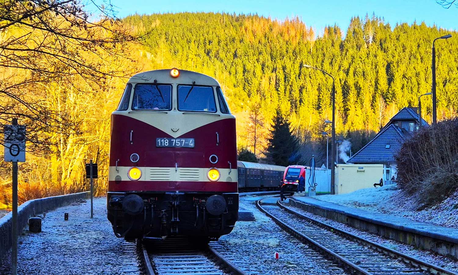 Kreuzung mit zwei Triebwagen der Baureihe 641 im Bf Sitzendorf-Unterweißbach