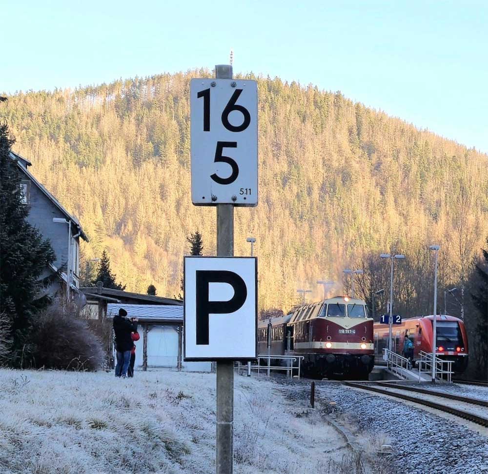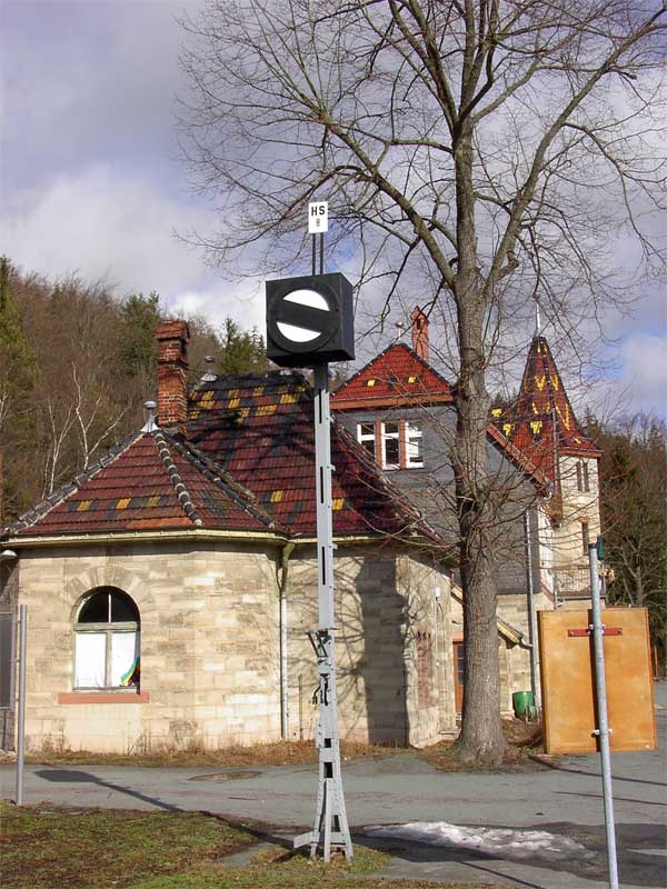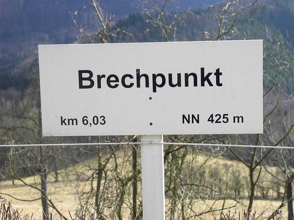 Brechpunkt der Strecke bei km 6,03 (Tafel steht im Bf Schwarzburg)