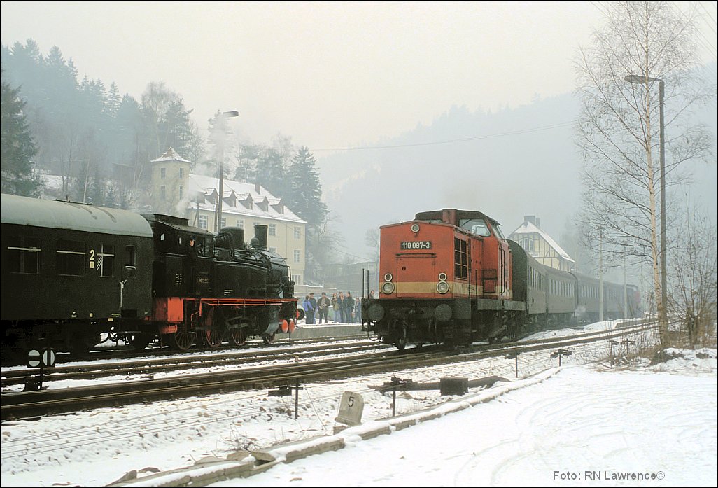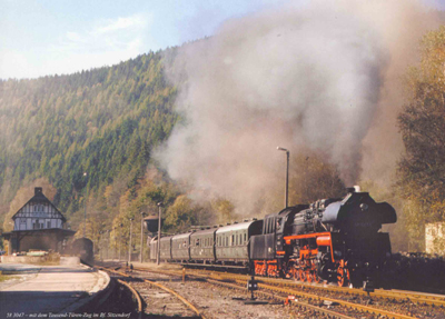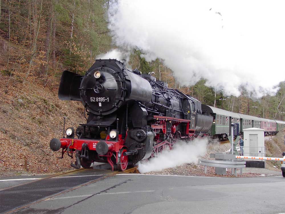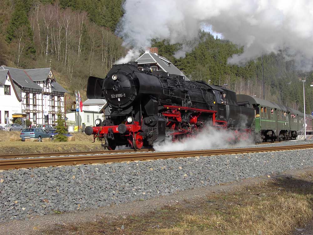 Bf Schwarzburg - Ausfahrt eines Sonderzuges mit der 52 8195 in Richtung Katzhütte