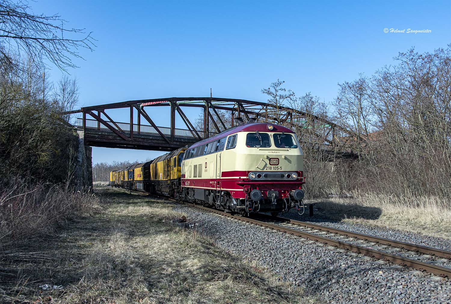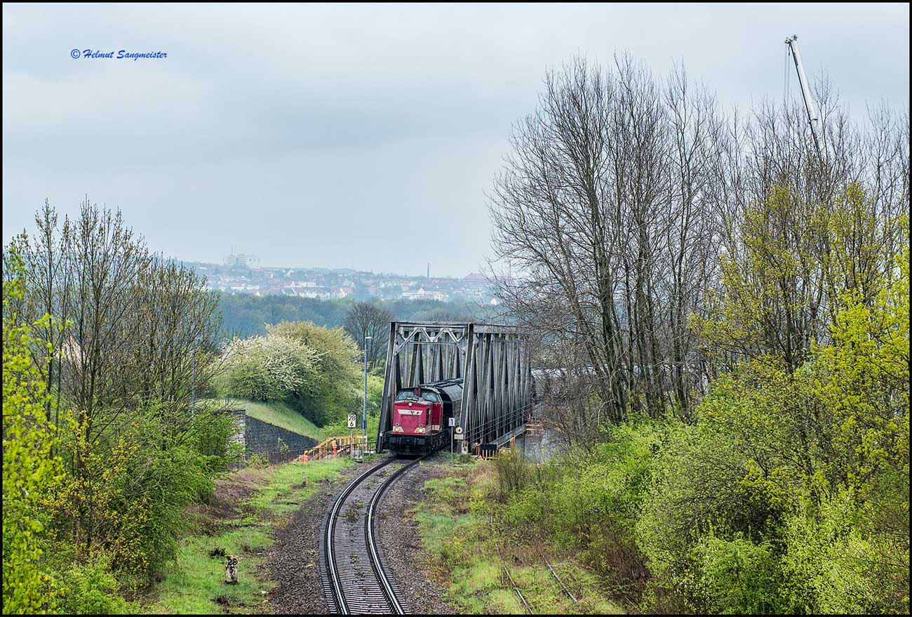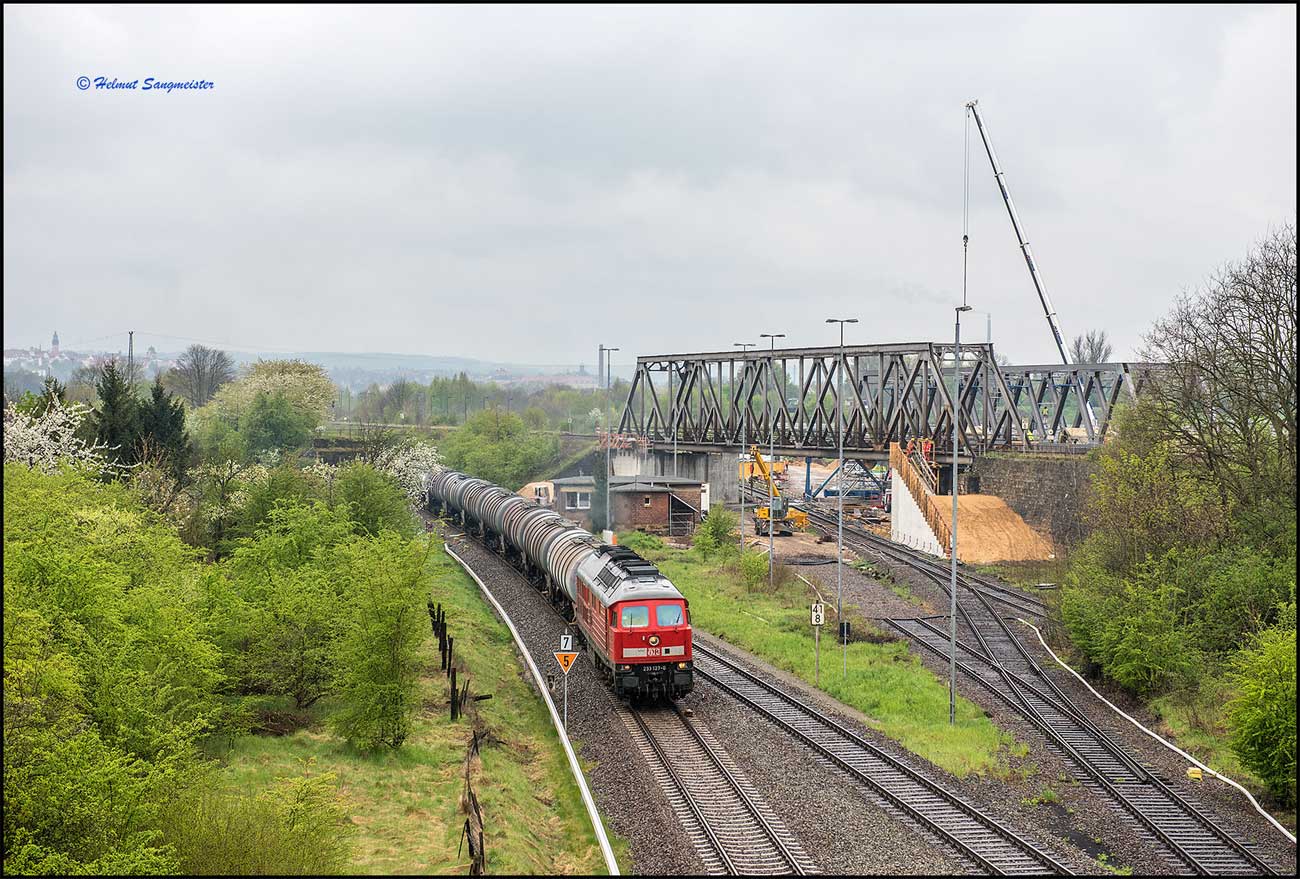 202 597 mit Güterzug als letzter Zug über die Brücke, die neue Brücke steht schon daneben.
