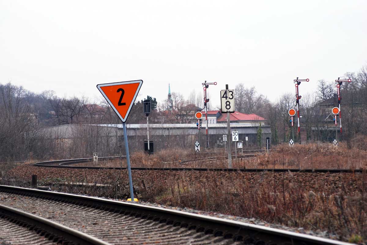 Im Vordergrund die Strecke Zeitz - Altenburg mit km 0,4,
