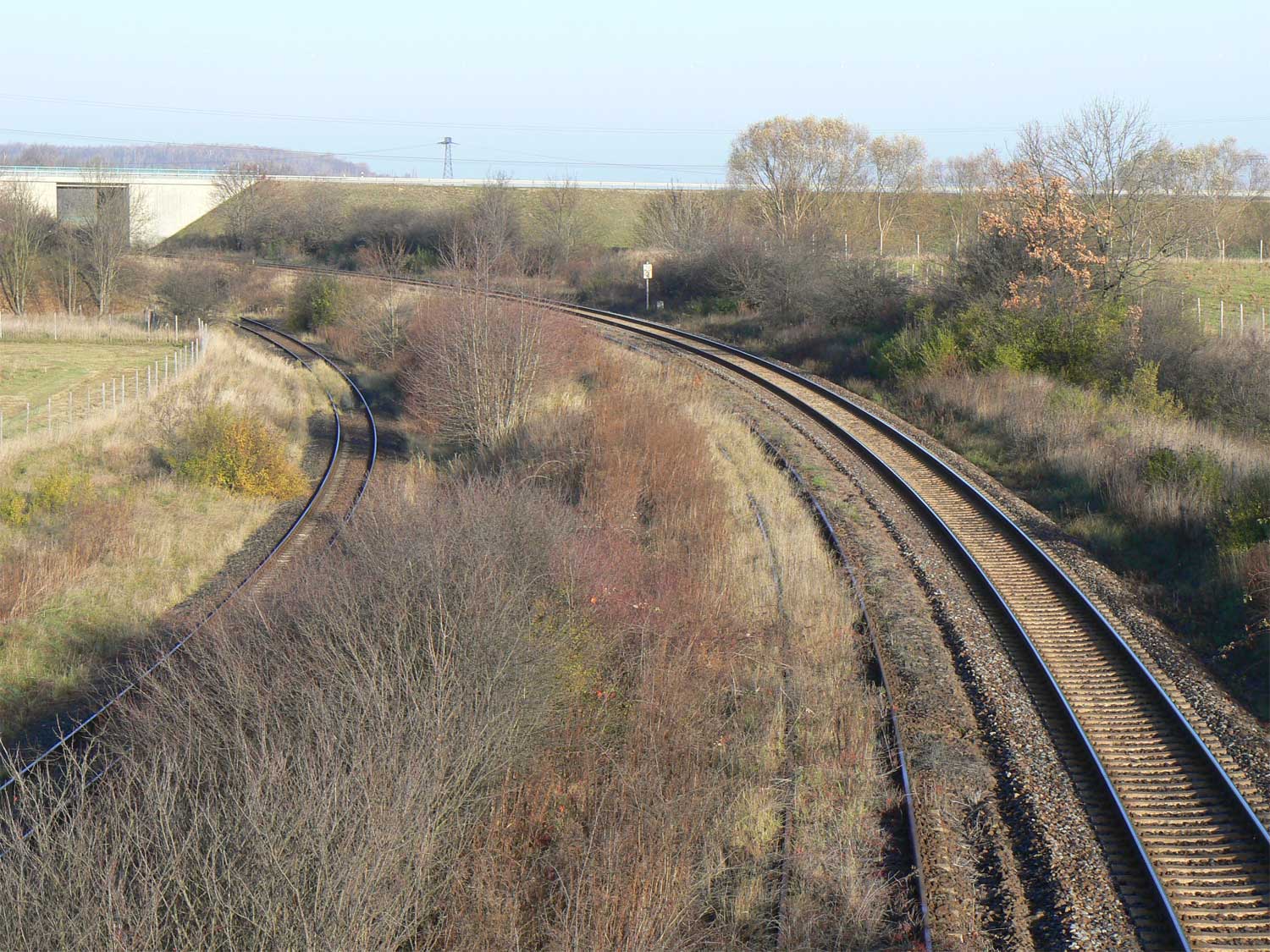 Kreuzungsfreie Einfädelung des Hauptgleises (links) von und zum Zeitzer Pbf und des Ein- und Ausfahrgleises (rechts) zum Zeitzer Gbf, Südseite am Abzw. Stw. Zn
