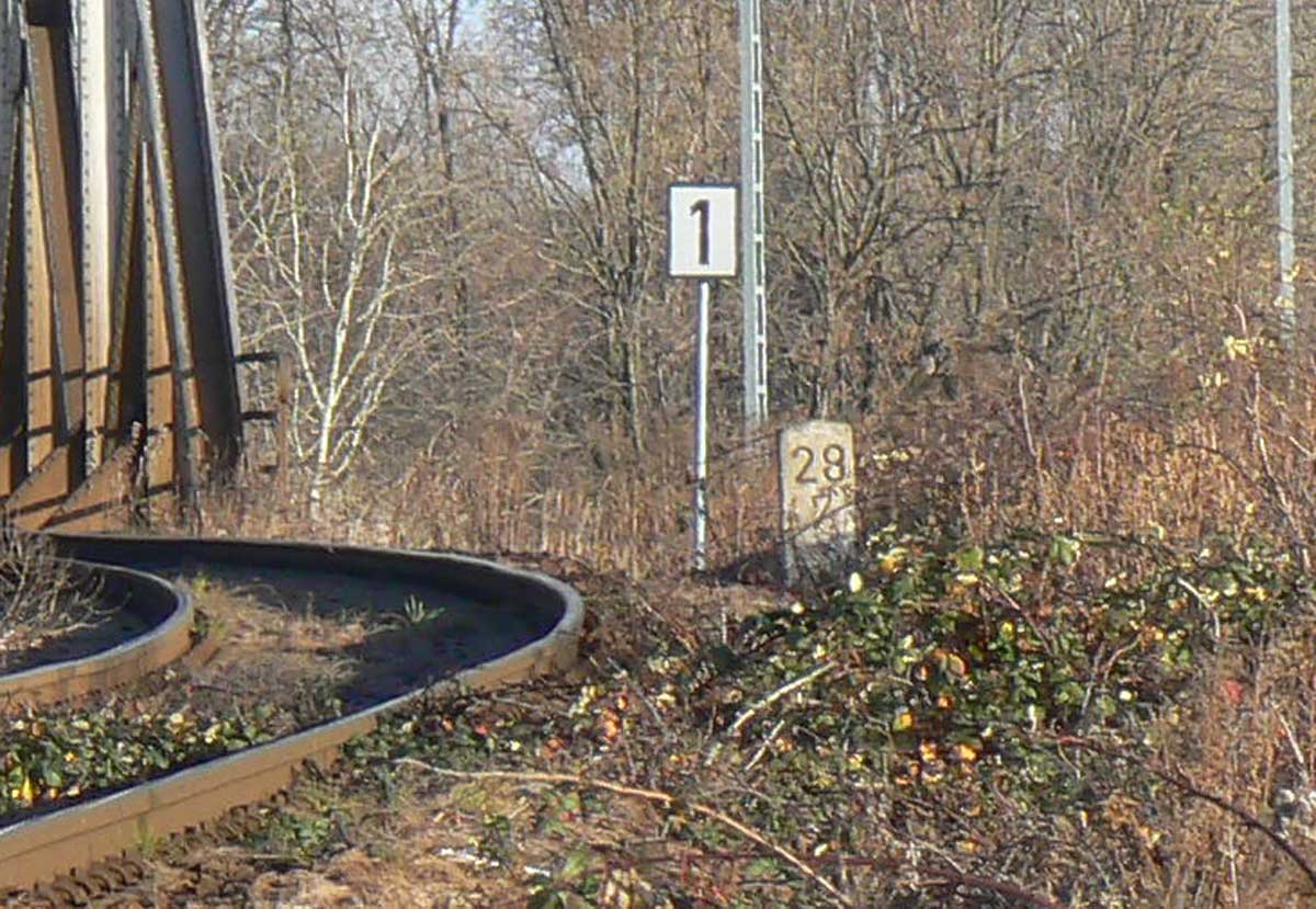 km 29,2 (Tafel); km 29,3 (Stein) und km 29,4 (Tafel) in Zeitz - Blick Richtung Weißenfels
