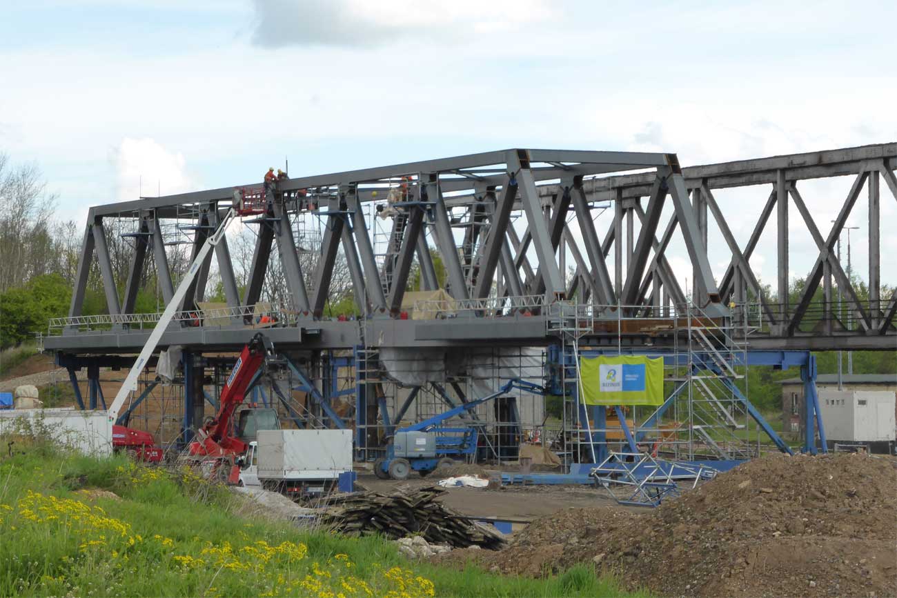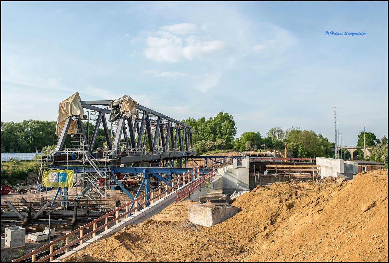 Die alte Brücke ist entfernt, die neue liegt zum Einschieben bereit.