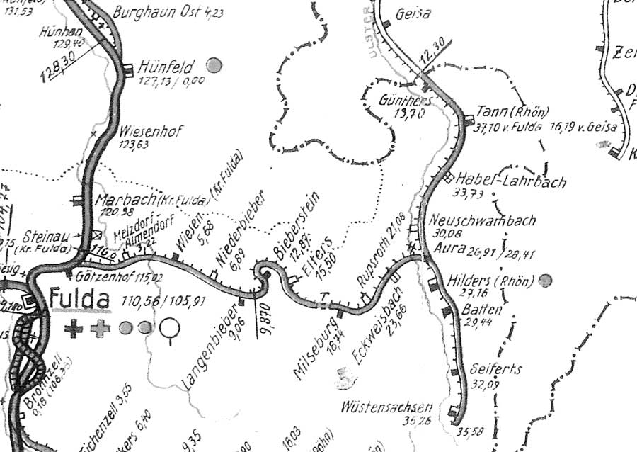 | Tann (Rhön) | 16,19 | km 37,10 der Strecke (Götzenhof 0,18) - Hilders (Rhön) 27,16 - Tann (Rhön) 37,10 |