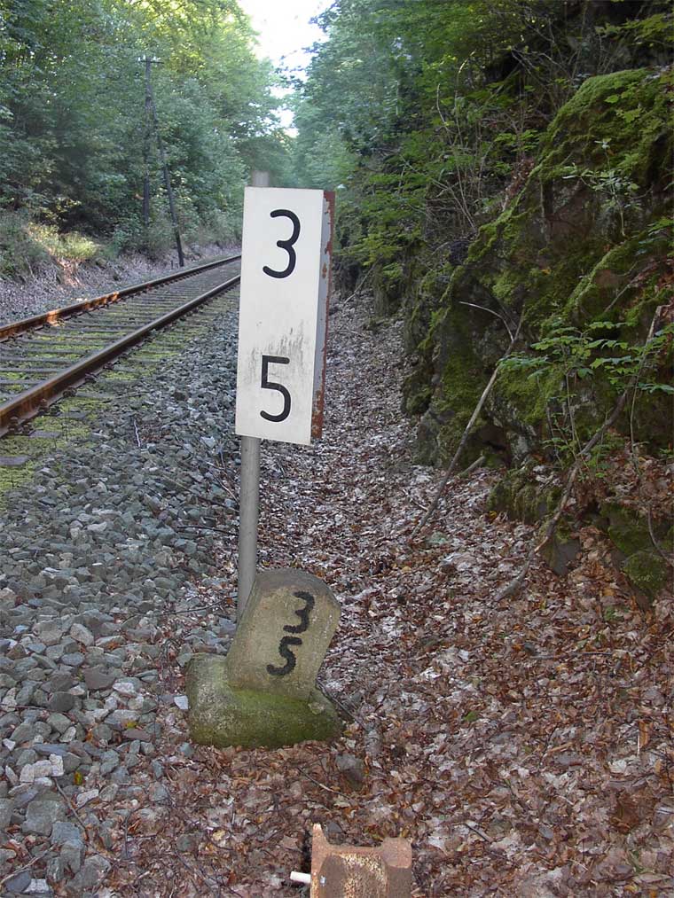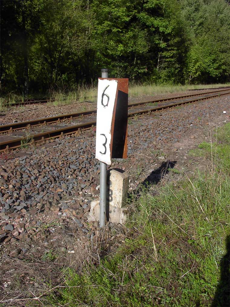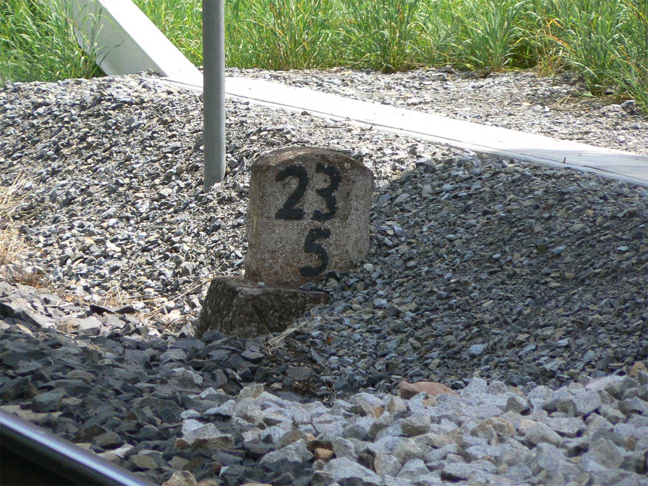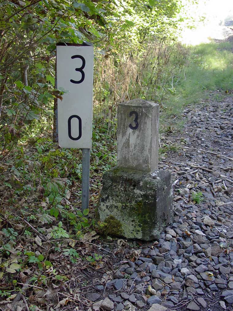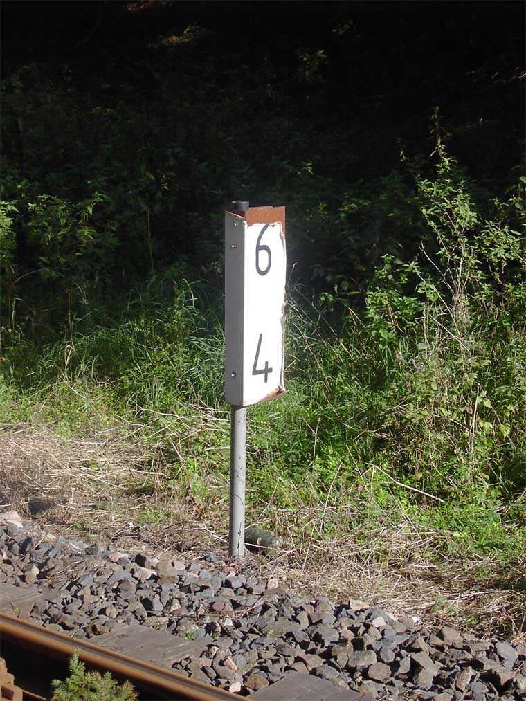 Auf der anderen Gleisseite bei km 6,4 steht ein Stein mit der Aufschrift 45. Es handelt sich um einen Kabelmerkstein der Deutschen Post.