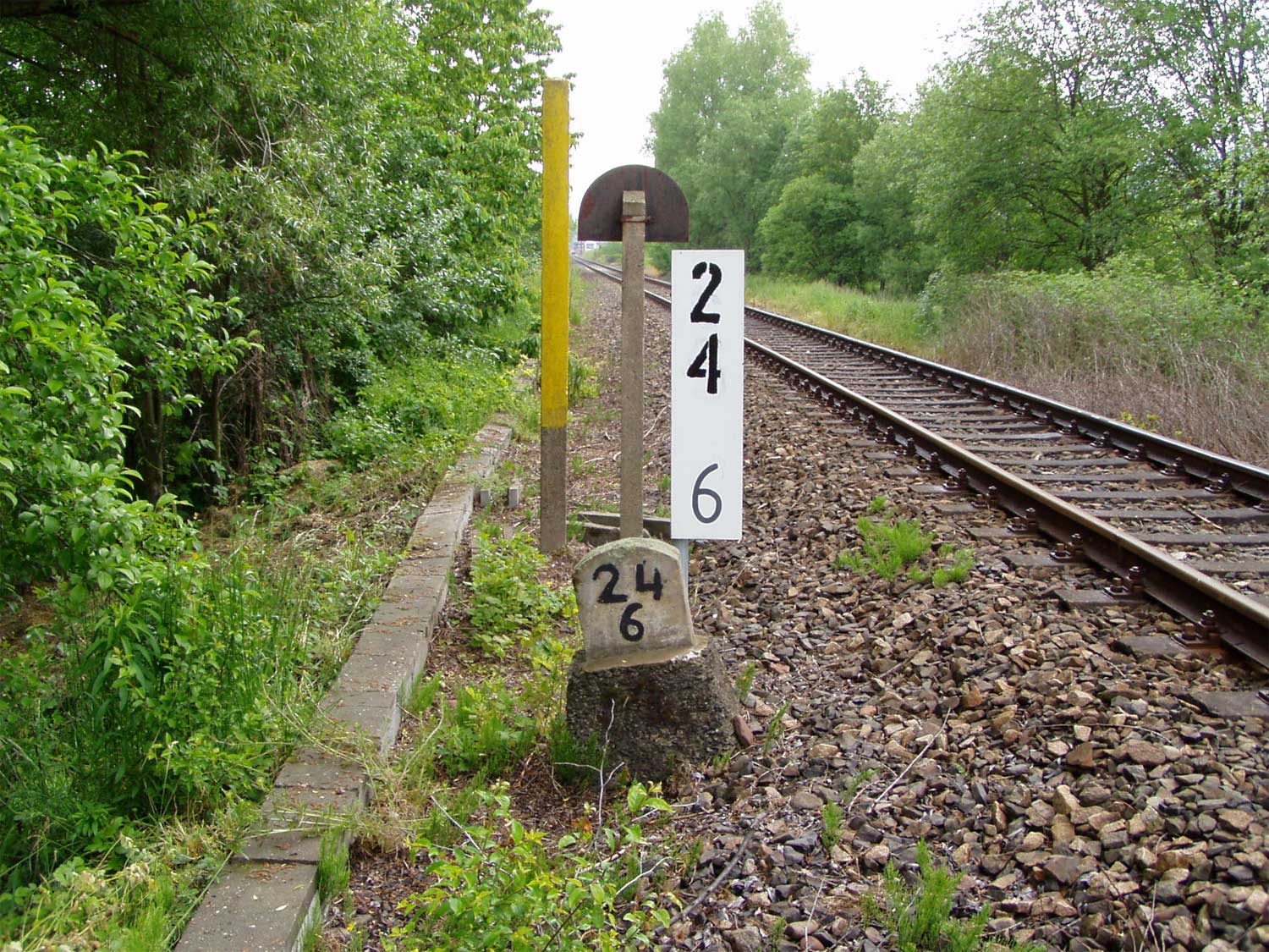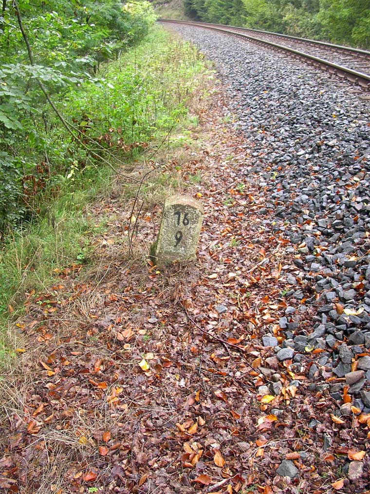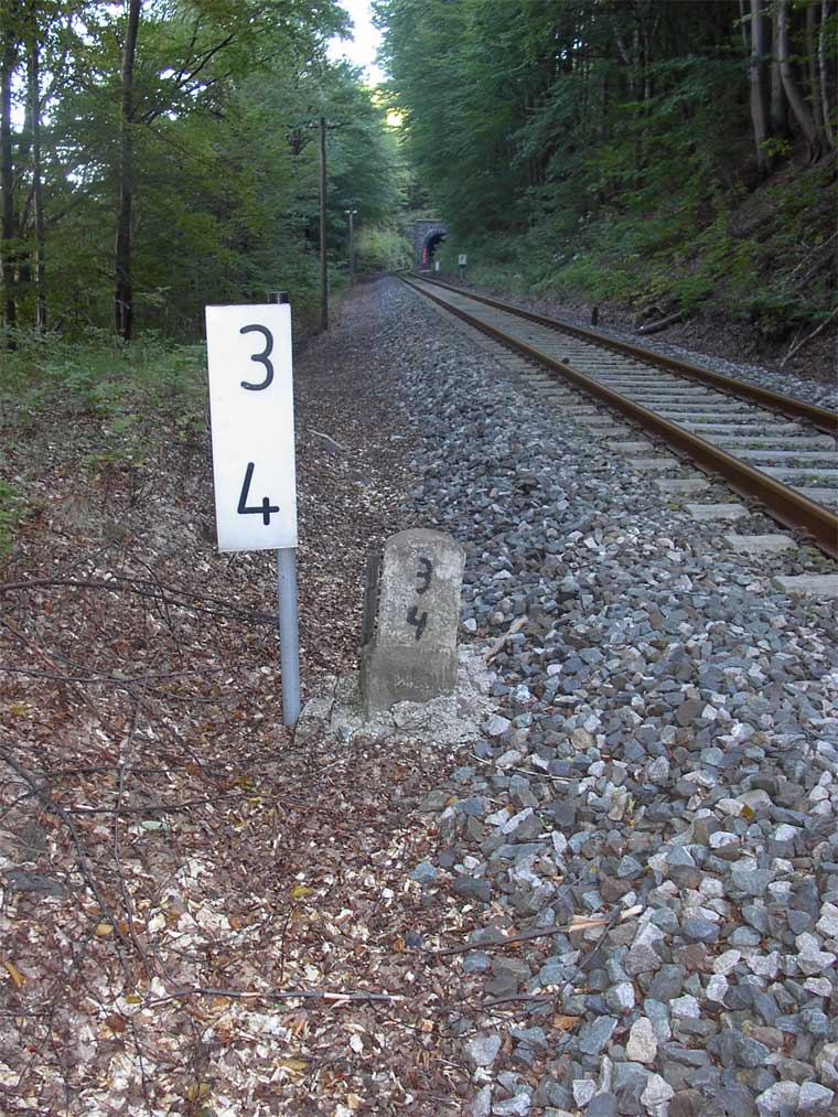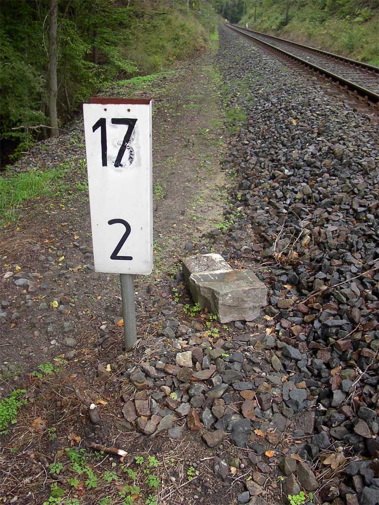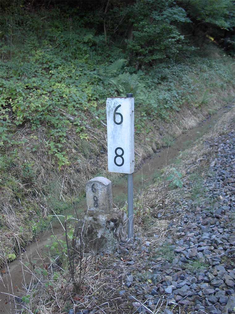 Auf der anderen Gleisseite bei km 6,4 steht ein Stein mit der Aufschrift 45. Es handelt sich um einen Kabelmerkstein der Deutschen Post.