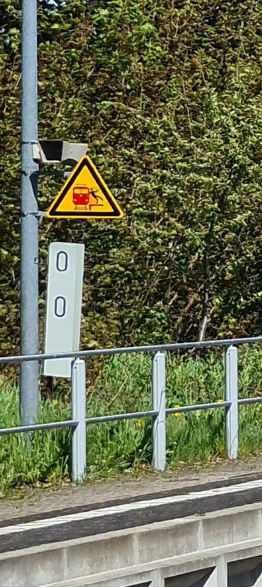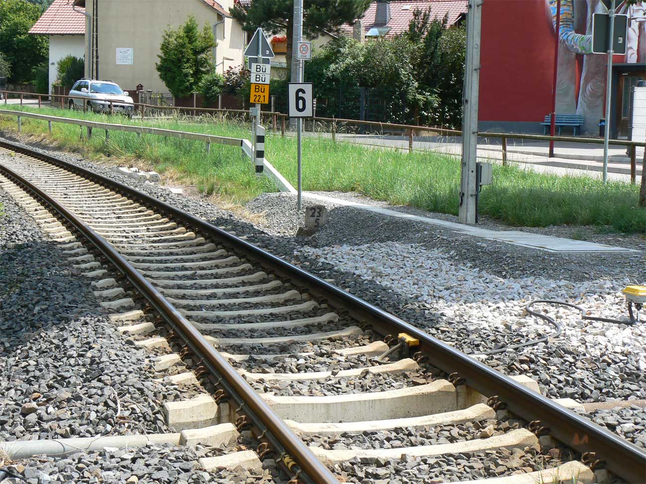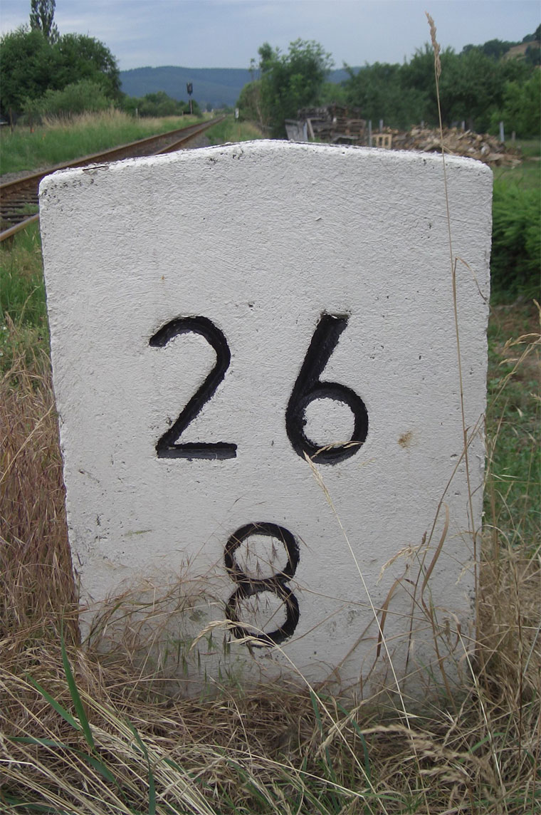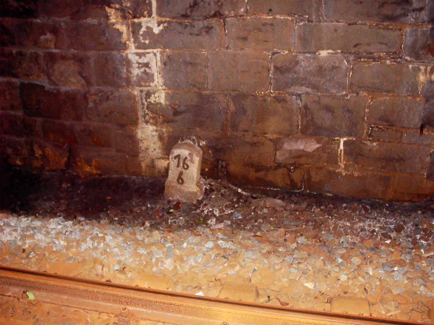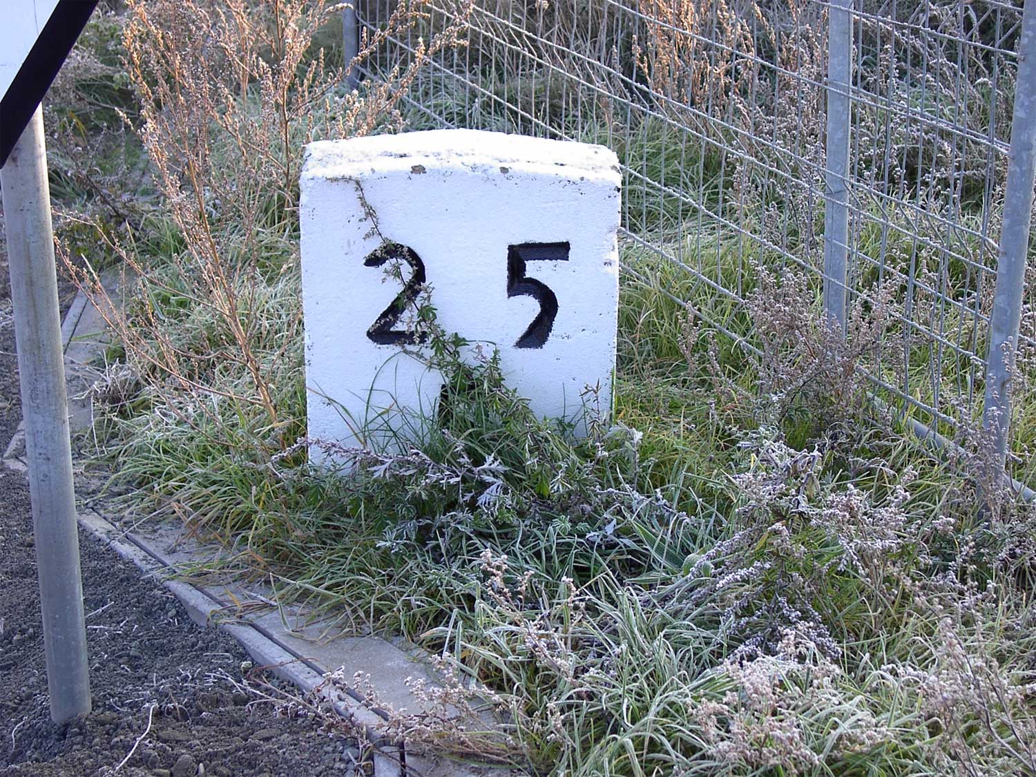 Auf der anderen Gleisseite bei km 6,4 steht ein Stein mit der Aufschrift 45. Es handelt sich um einen Kabelmerkstein der Deutschen Post.