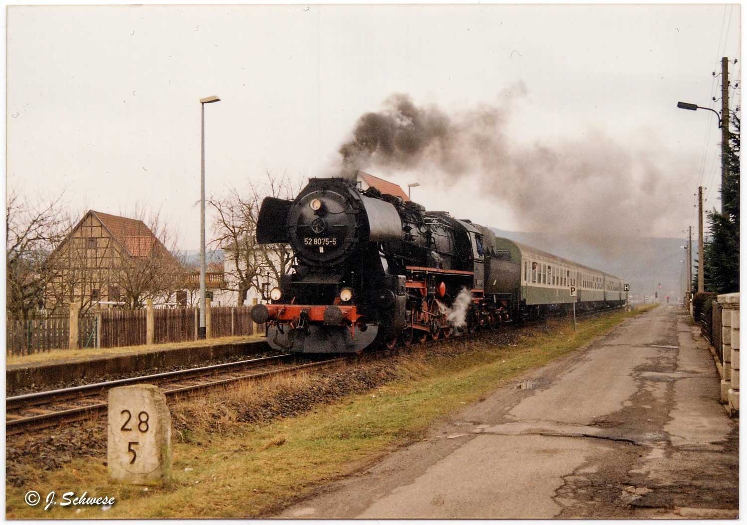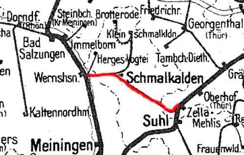 | Wernshausen | 30,42 | km 41,35 der Strecke Eisenach 0,0 - Bad Salzungen 26,74 - Meiningen 60,69 - Eisfeld 108,29 - Streckenunterbrechung - Grenze DDR/BRD 114,17 - Streckenunterbrechung - Coburg 130,12 - Lichtenfels 150,99 |