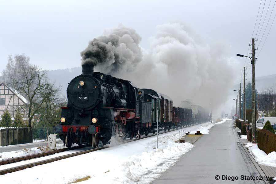 km 28,7 bei Niederschmalkalden - 58 311 mit einen Fotogüterzug am 21.02.2009